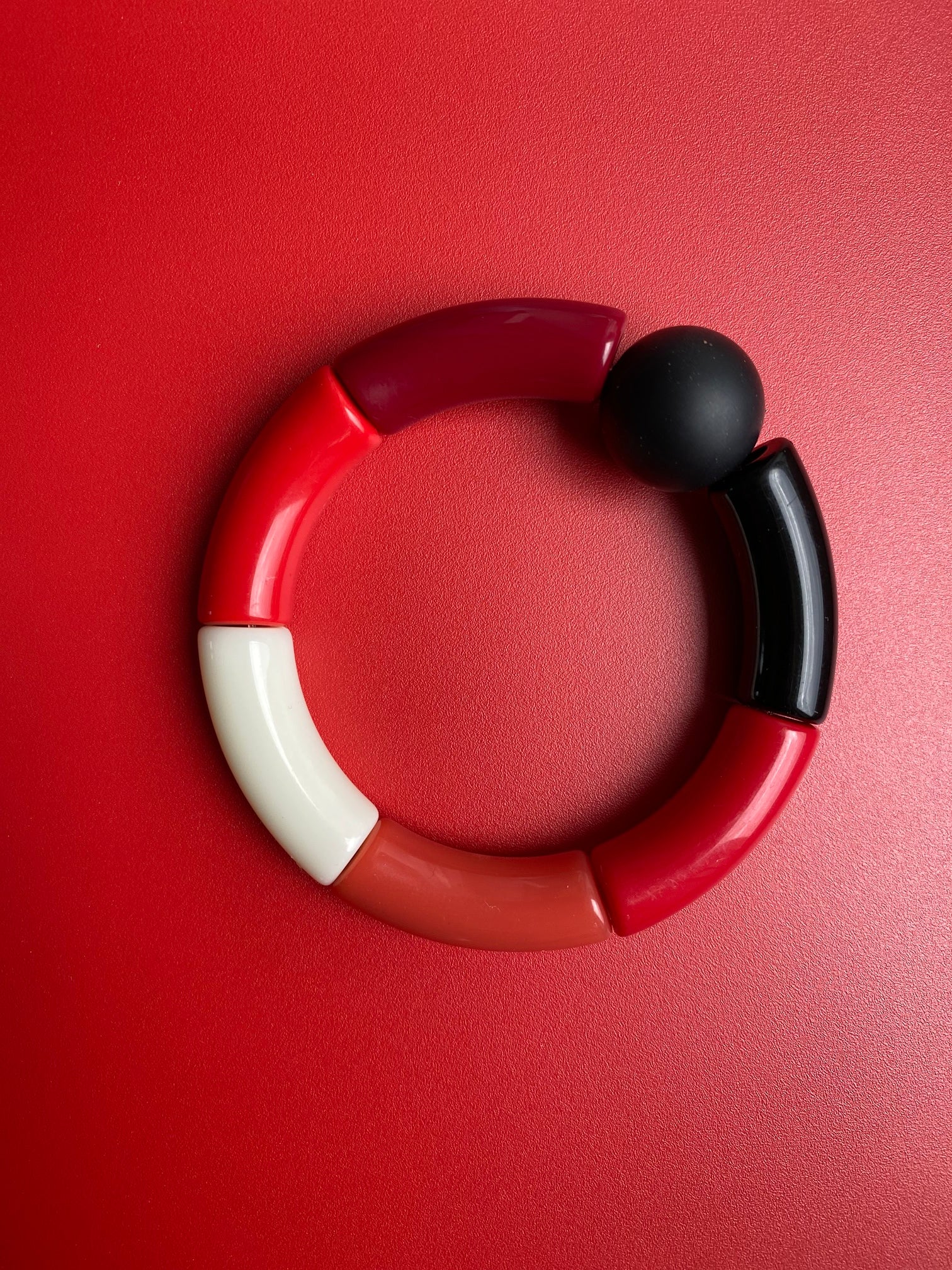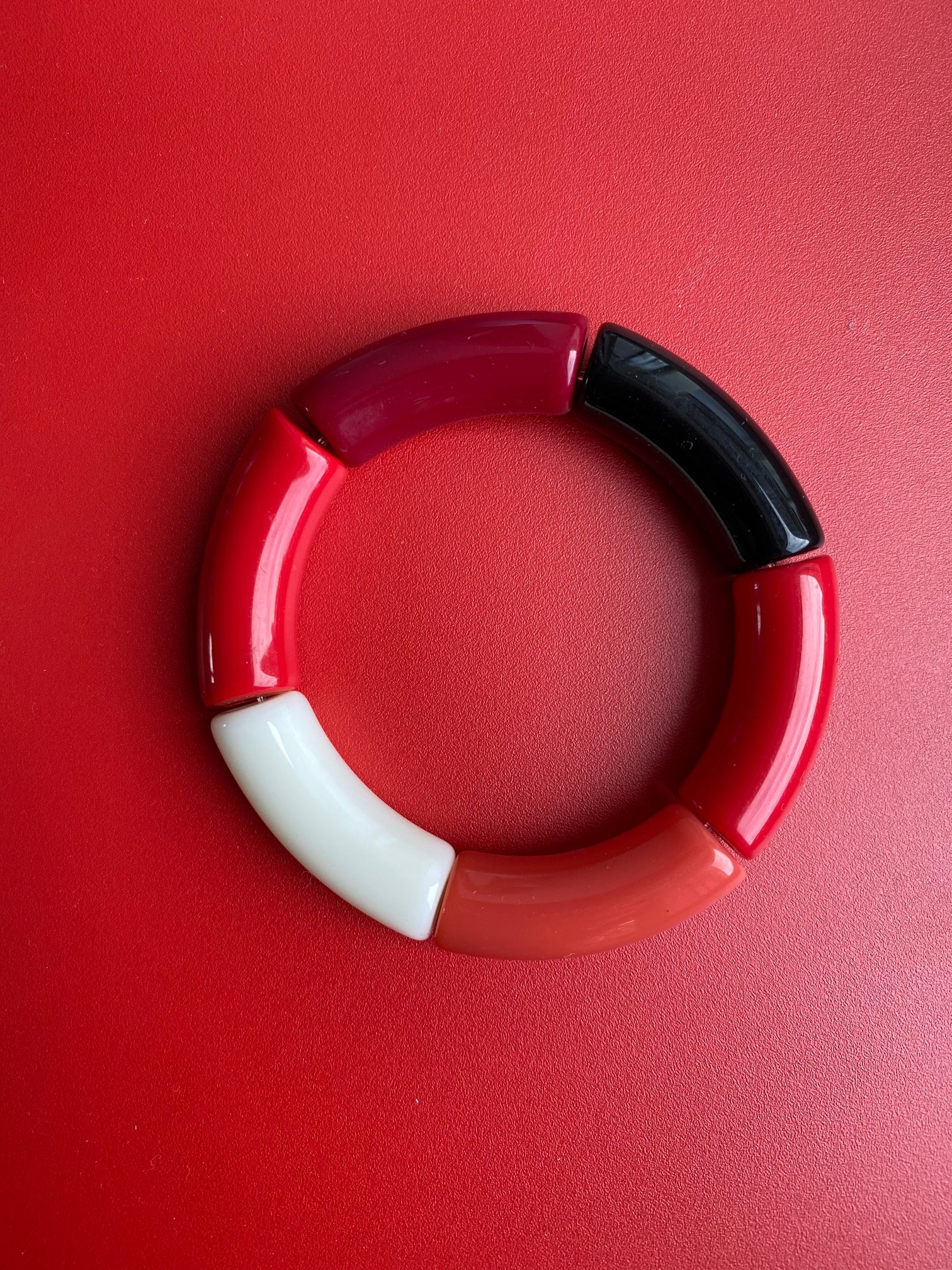 Spana in läckra Armring Röd! Ett lätt färgglatt armband av böjda pärlor i plast i starka röda färger. Ger din stil färg, glädje och personlighet! En cool accessoar till jobb, vardag eller fest! Finns i många härliga färgkombinationer! Nytt lägre pris!