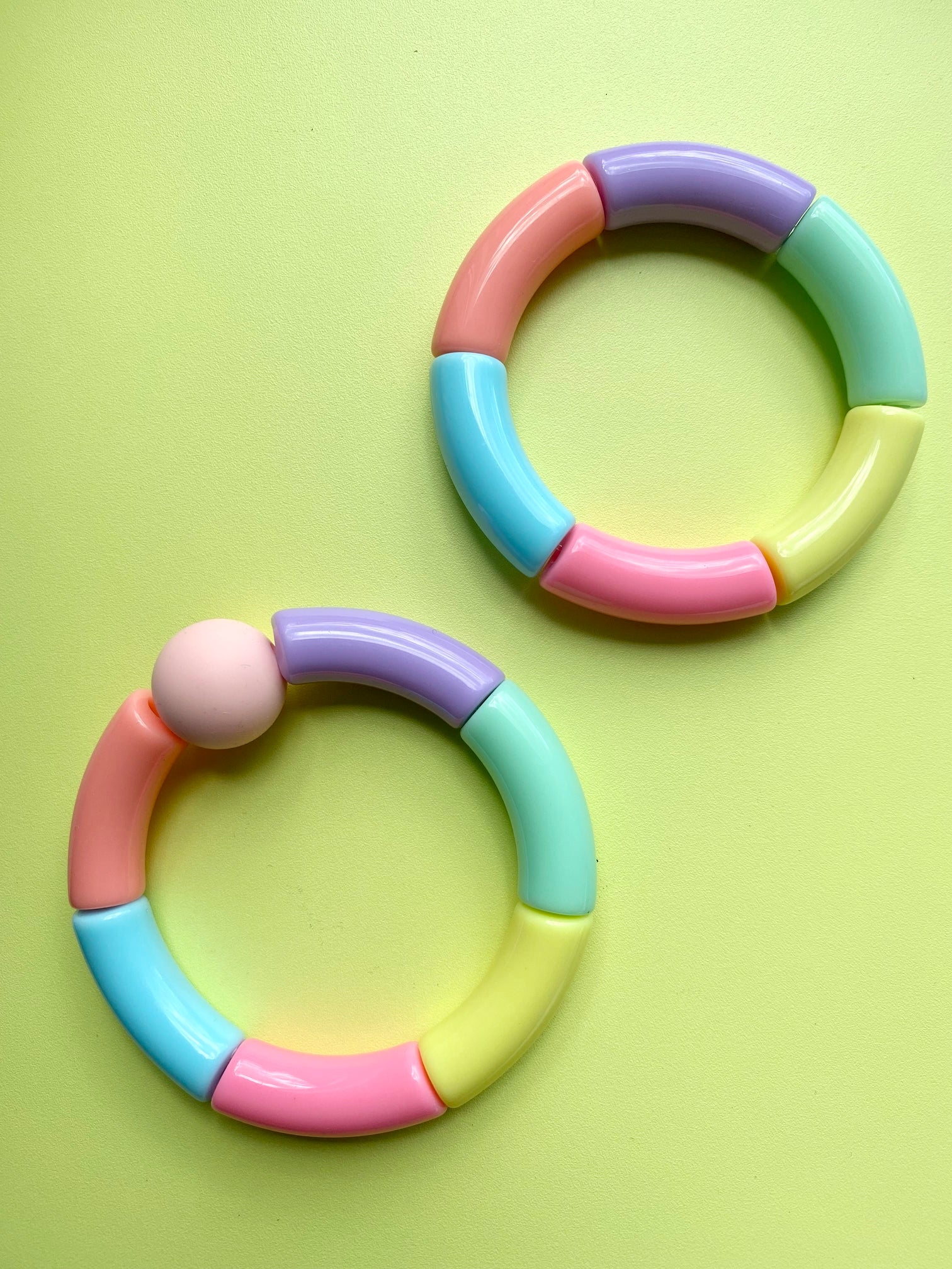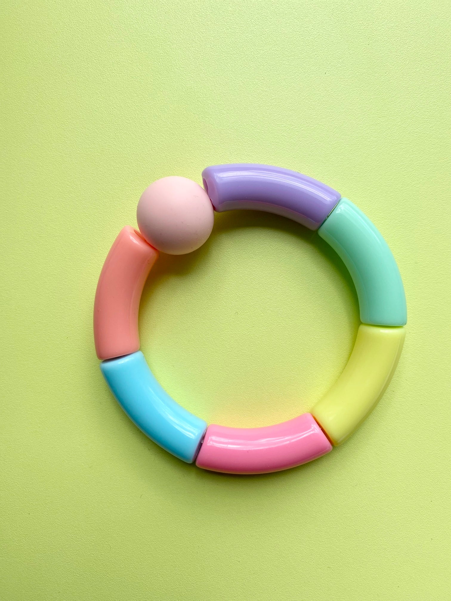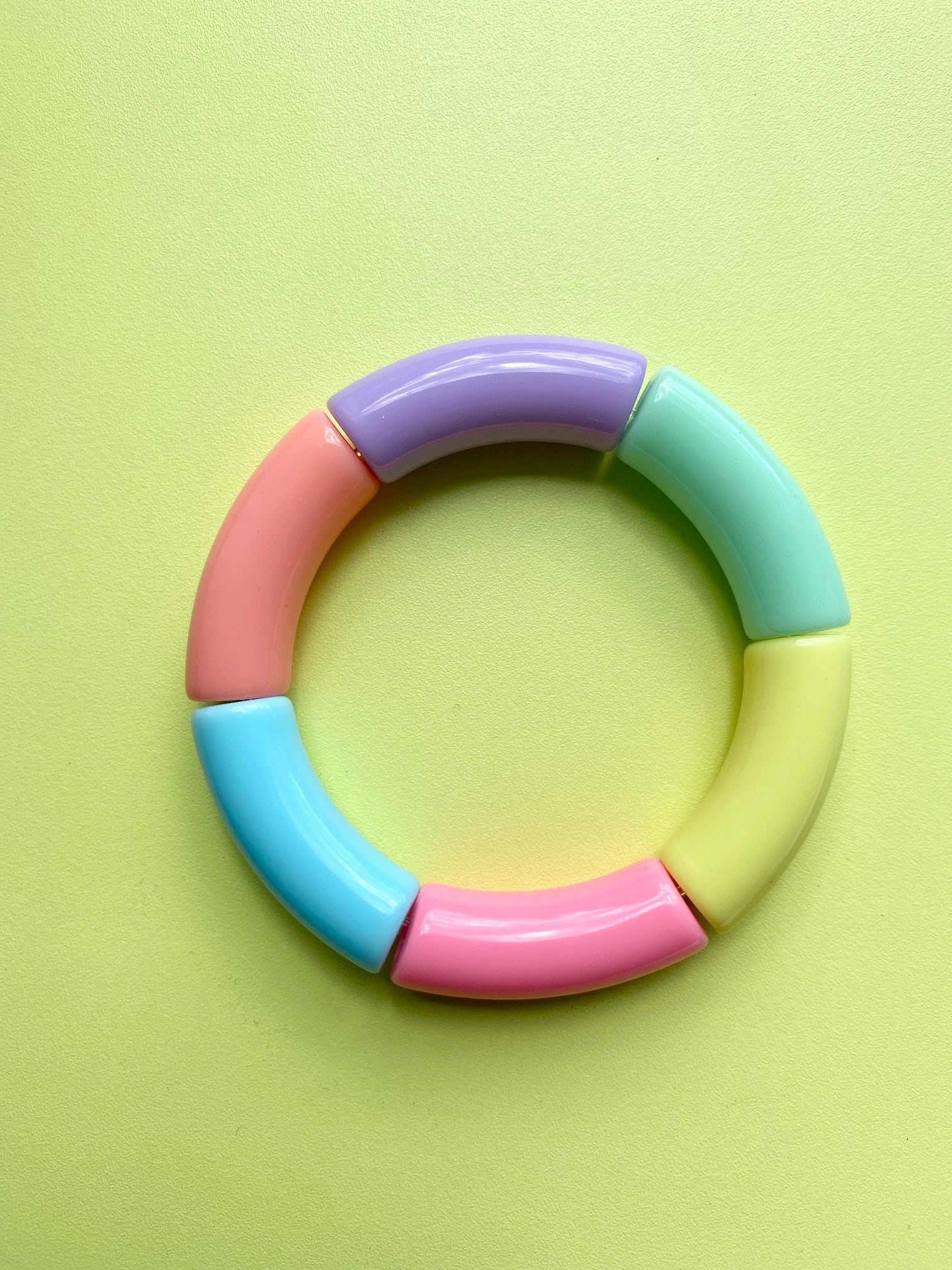 Välkommen till 80-talet! Ett lätt färgglatt armband av böjda pärlor i plast i läckra pastellfärger. Ger din stil färg, glädje och personlighet! En cool accessoar till jobb, vardag eller fest! Finns i många härliga färgkombinationer! Nytt lägre pris!