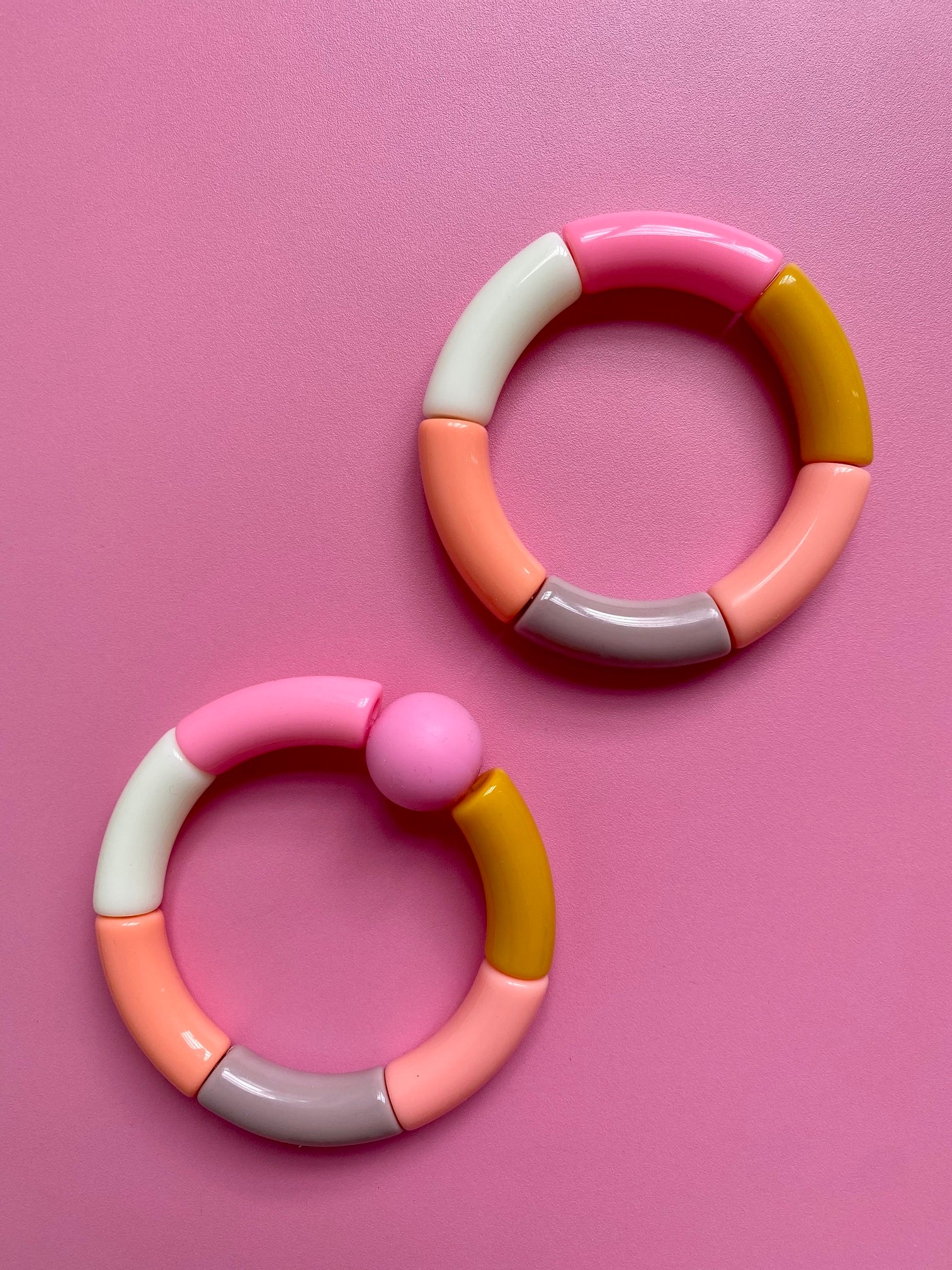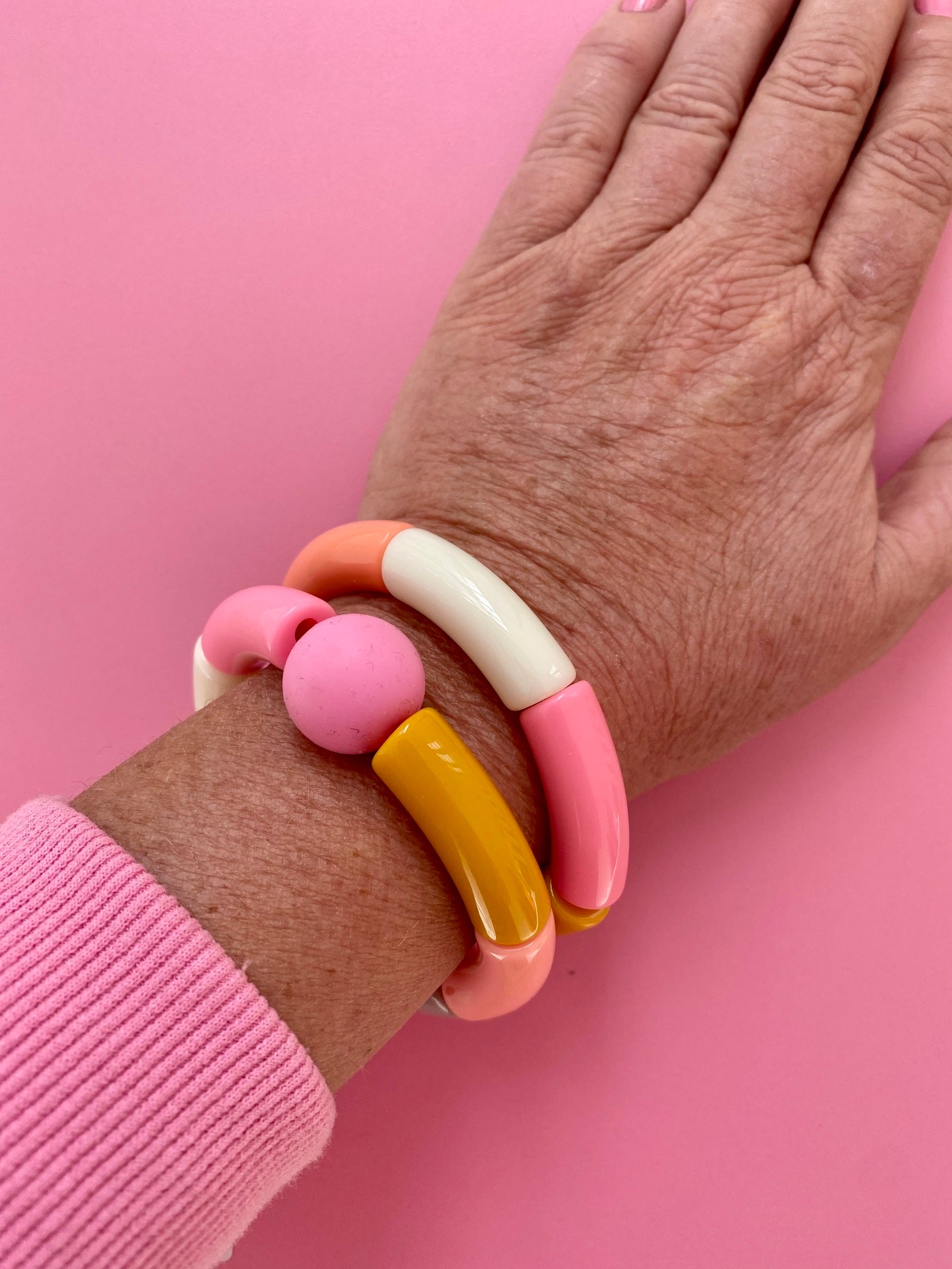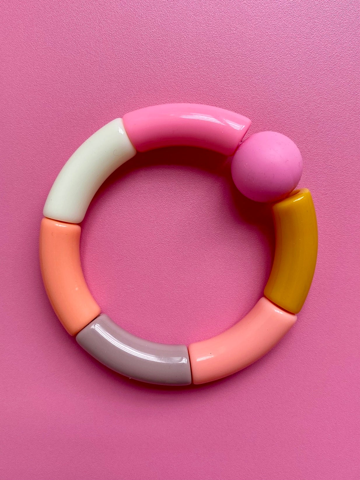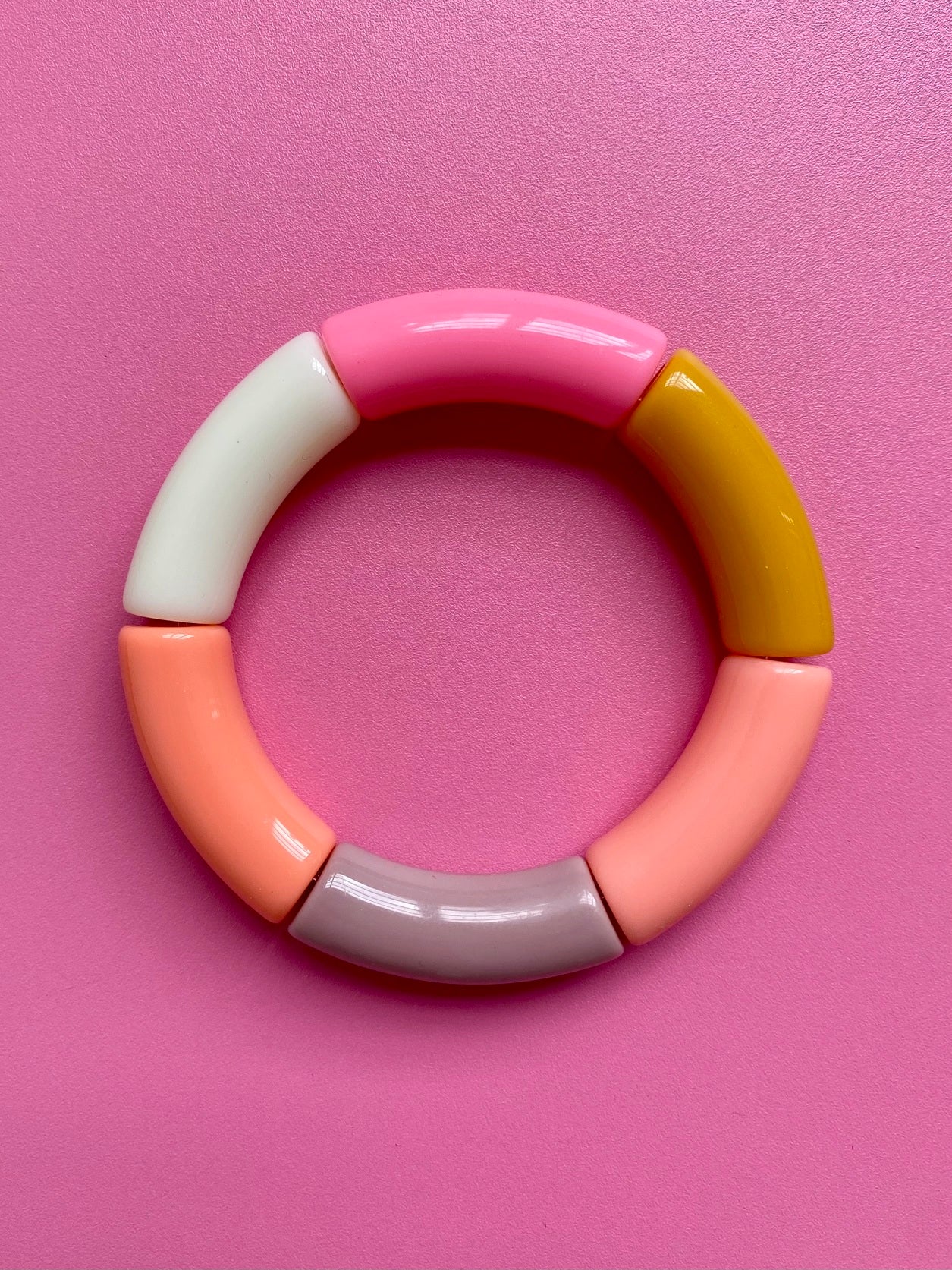 Sommarens FINASTE armband! Ett lätt färgglatt armband av böjda pärlor i plast i starka rosa, gul och beige. Ger din stil färg, glädje och personlighet! En cool accessoar till jobb, vardag eller fest! Finns i många härliga färgkombinationer! Nytt lägre pris!