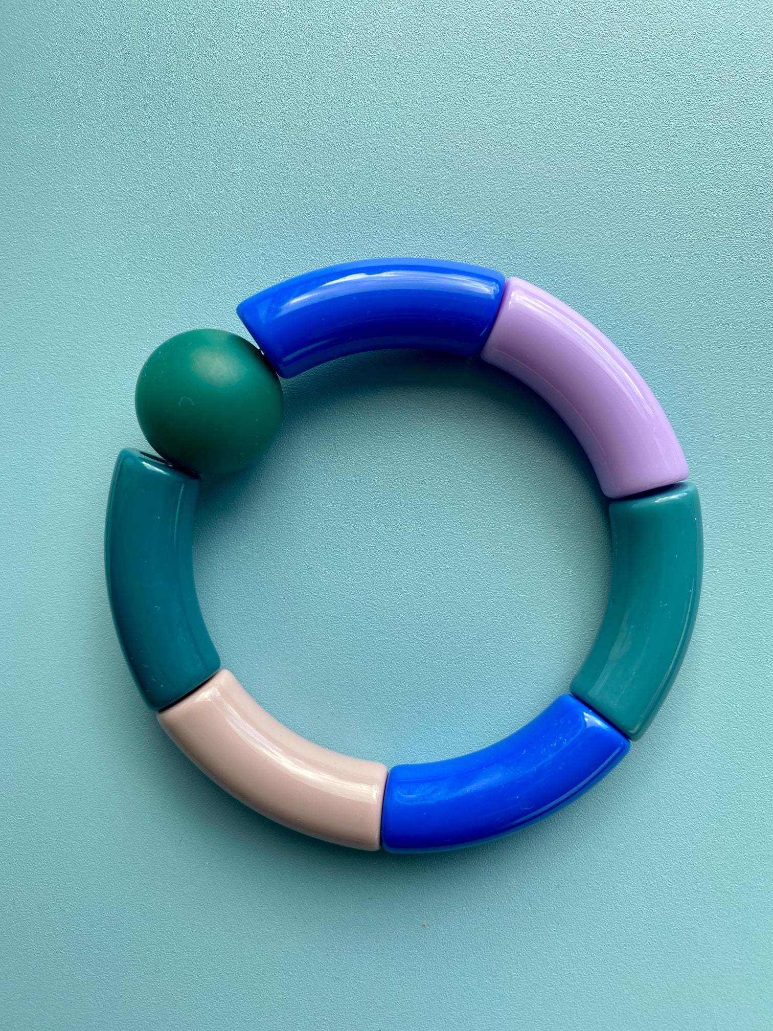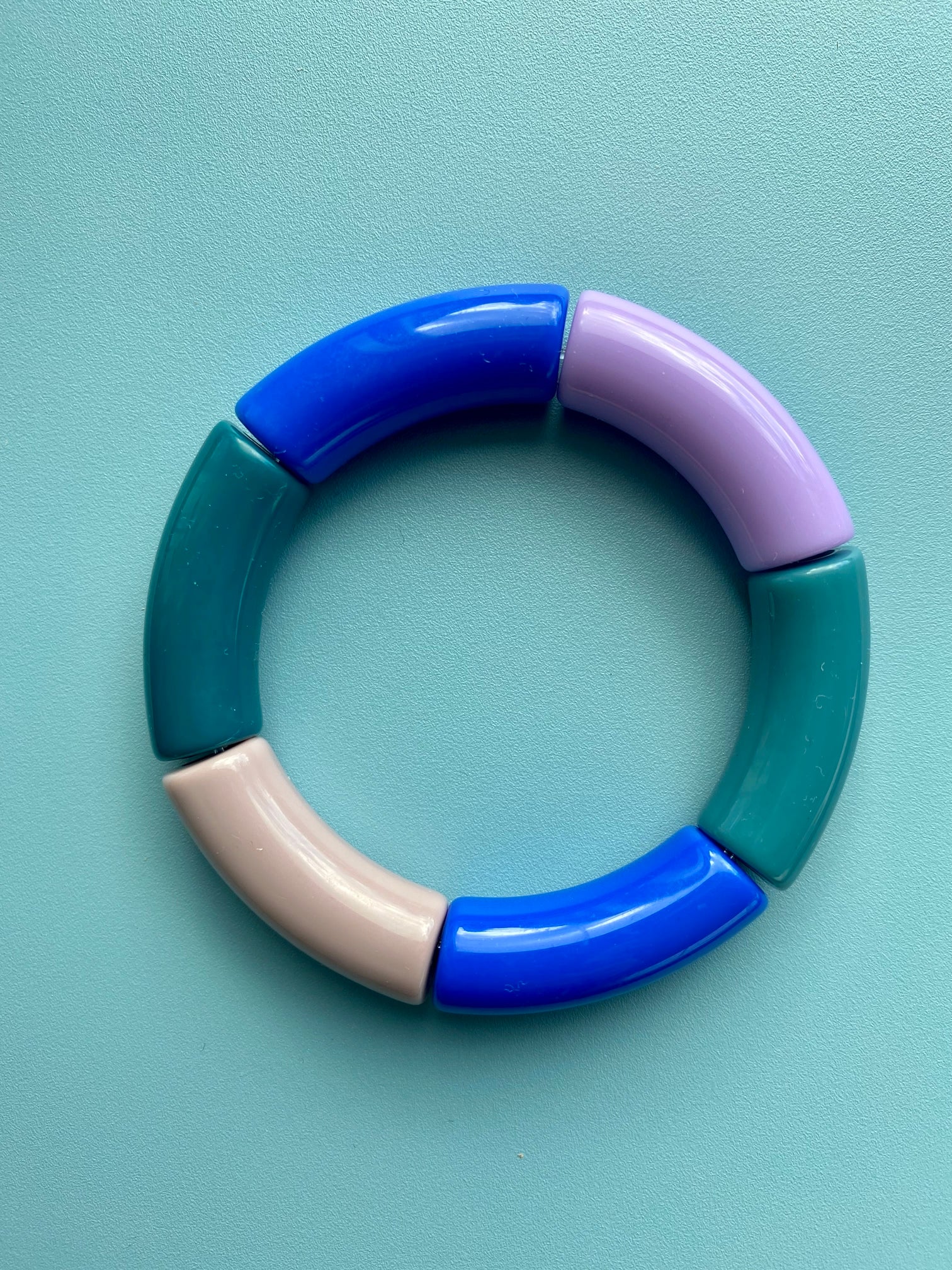 Spännande FÄRGKOMBO, en favorit! Ett lätt färgglatt armband av böjda pärlor i plast i starka blå, lila o gröna färger. Ger din stil färg, glädje och personlighet! En cool accessoar till jobb, vardag eller fest! Finns i många härliga färgkombinationer! Nytt lägre pris!