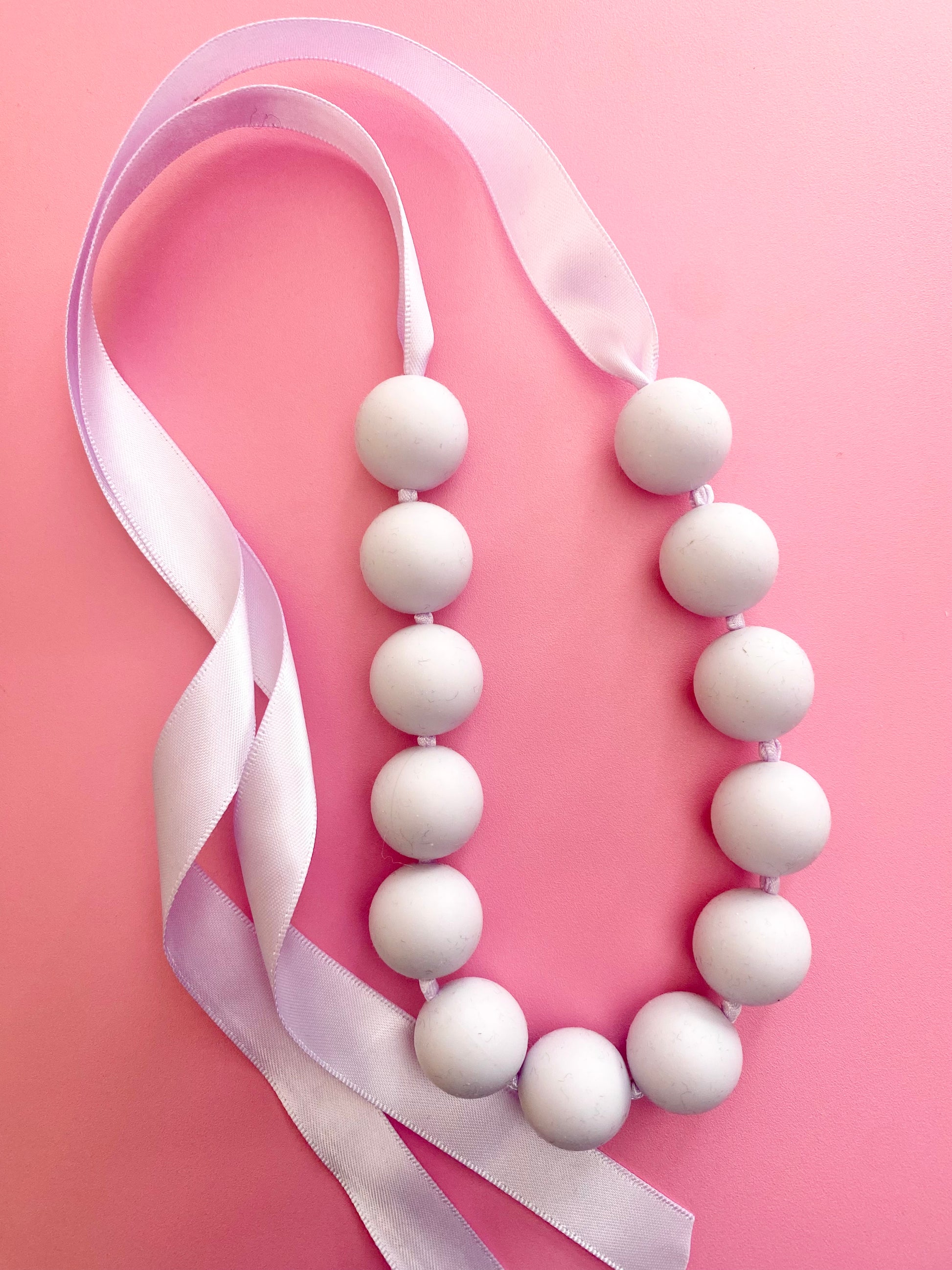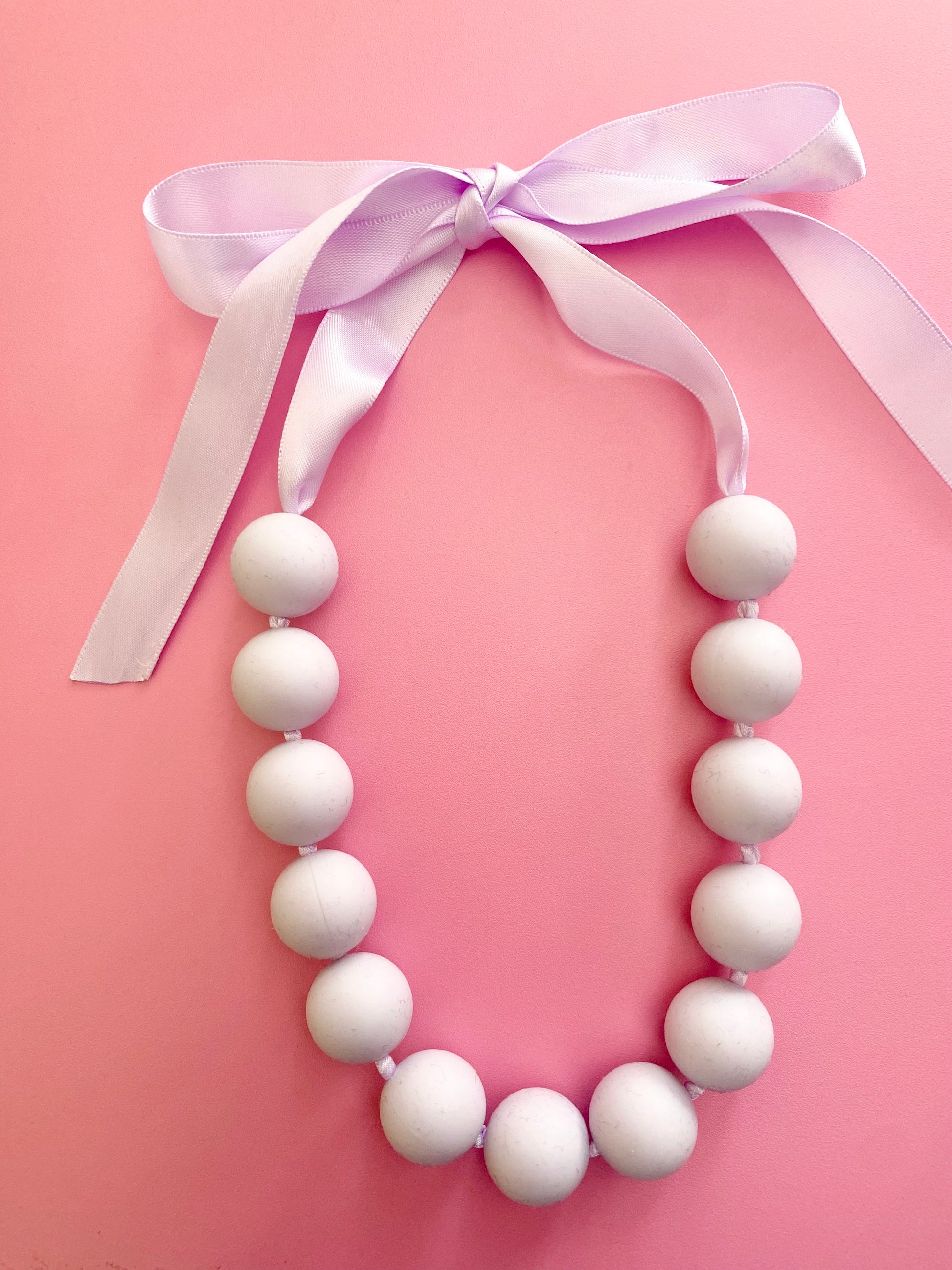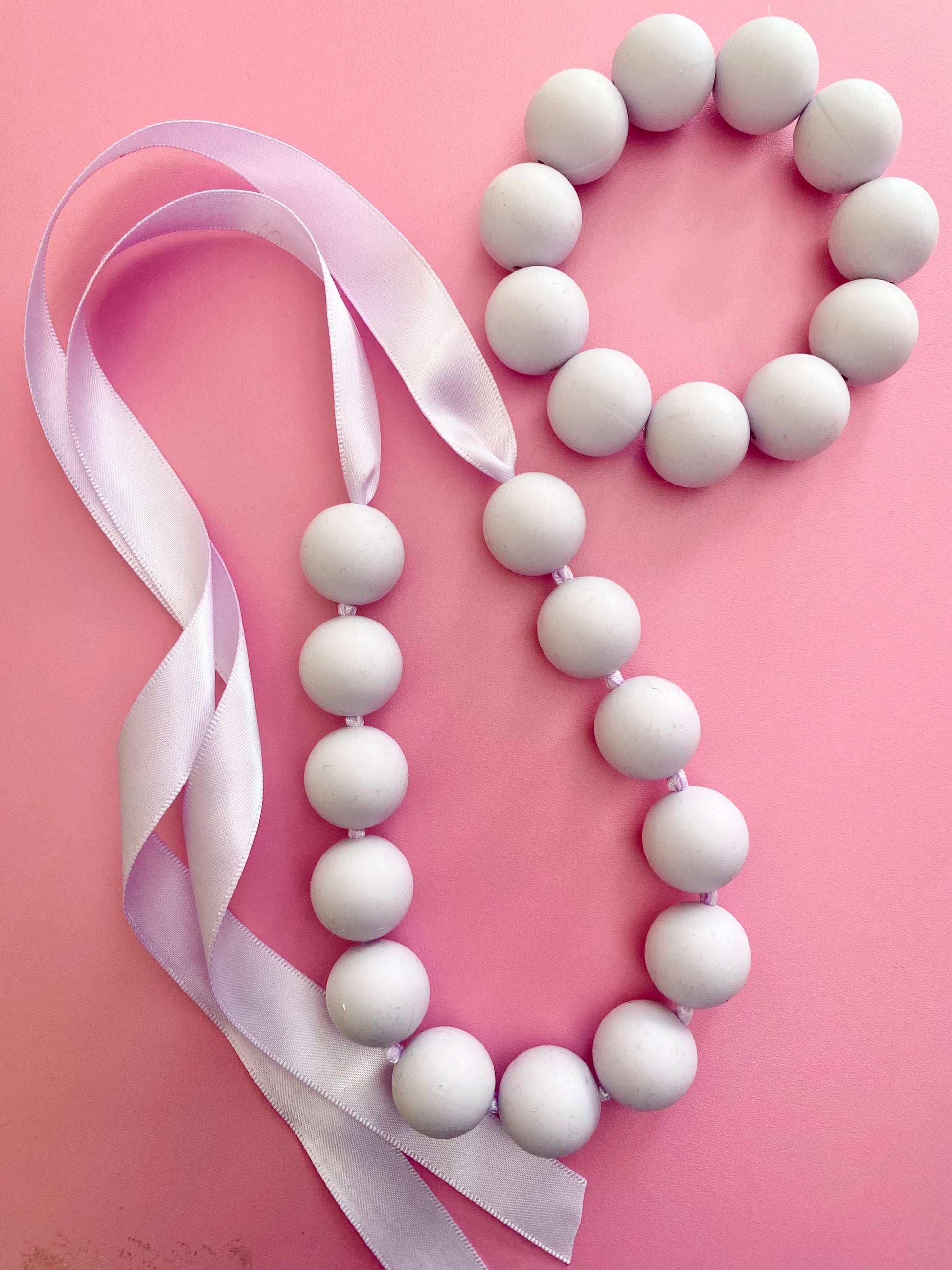 NU ÄNTLIGEN!! De nya läckra halsbanden i MAXI-pärlor är nu här! Ett ljuslila statement halsband av mjuka stora silikonpärlor som hängs om halsen genom att knyta en rosett av det vackra satinbandet. Ger din stil färg, glädje och personlighet! En läcker accessoar till jobb, vardag eller fest! Finns i många härliga färger! Du kan även köpa halsbanden som ett SET tillsammans med tillhörande armband. Det finns även tillhörande ringar i silver eller guldplätering med den färgglada stora pärlan, se kategori ringar.