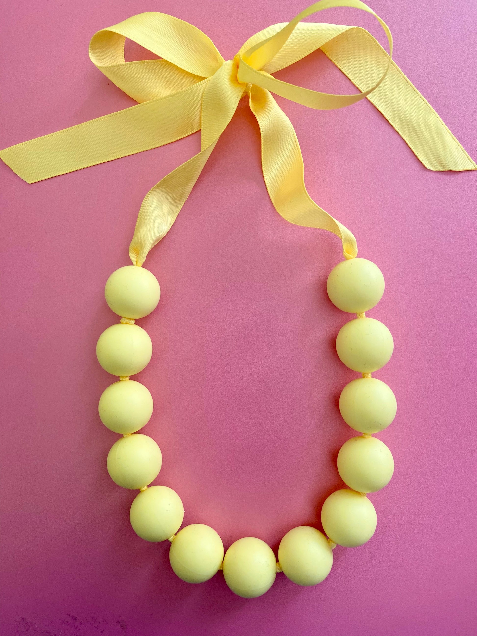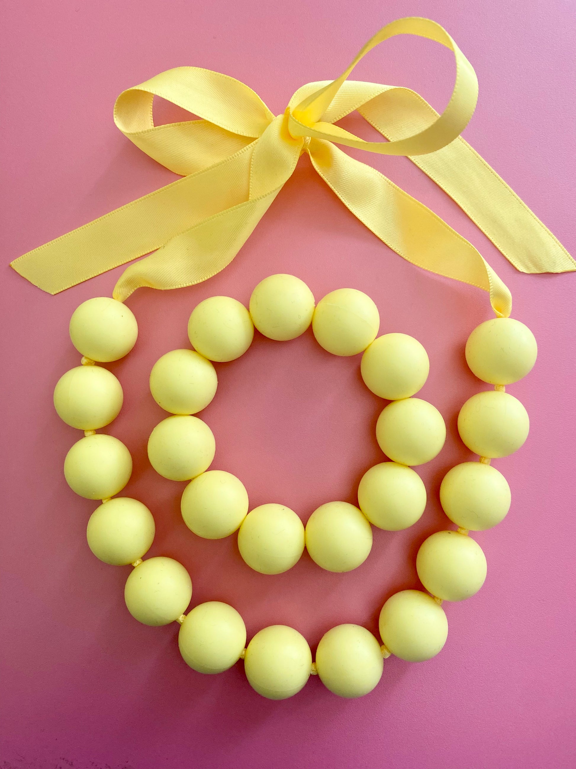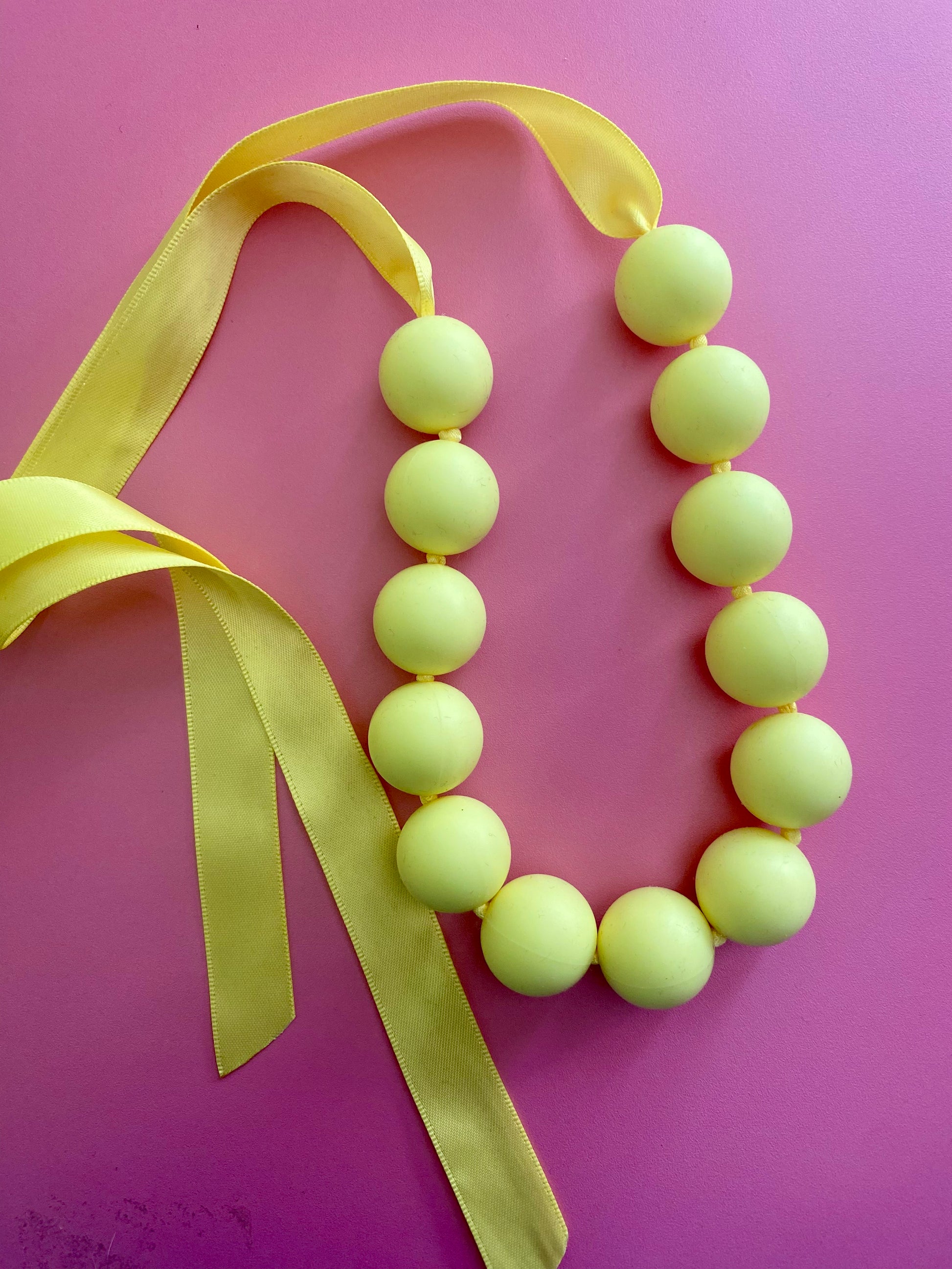 NU ÄNTLIGEN!! De nya läckra halsbanden i MAXI-pärlor är nu här! Ett ljusgult statement halsband av mjuka stora silikonpärlor som hängs om halsen genom att knyta en rosett av det vackra satinbandet. Ger din stil färg, glädje och personlighet! En läcker accessoar till jobb, vardag eller fest! Finns i många härliga färger! Du kan även köpa halsbanden som ett SET tillsammans med tillhörande armband. Det finns även tillhörande ringar i silver eller guldplätering med den färgglada stora pärlan, se kategori ringar.