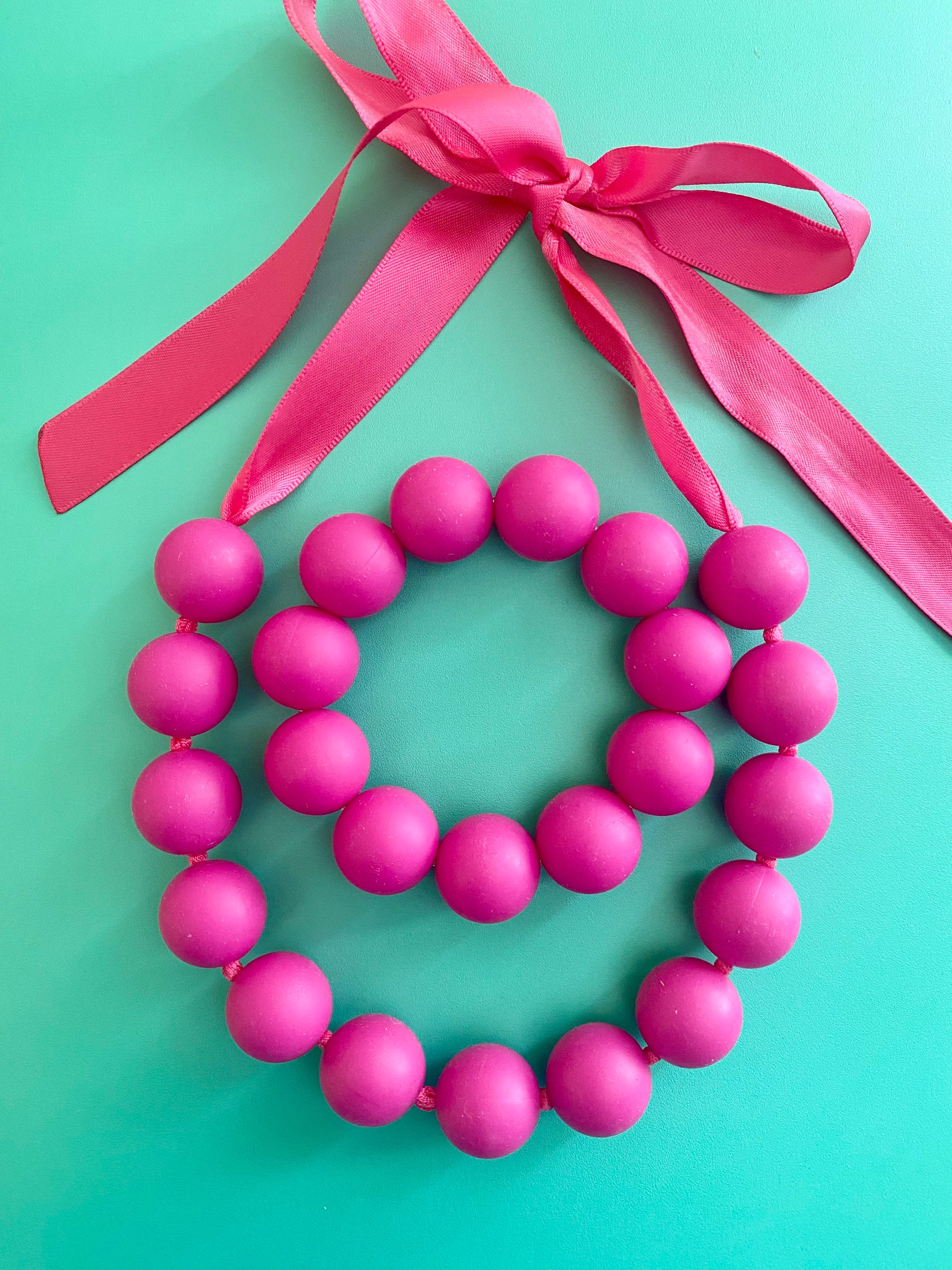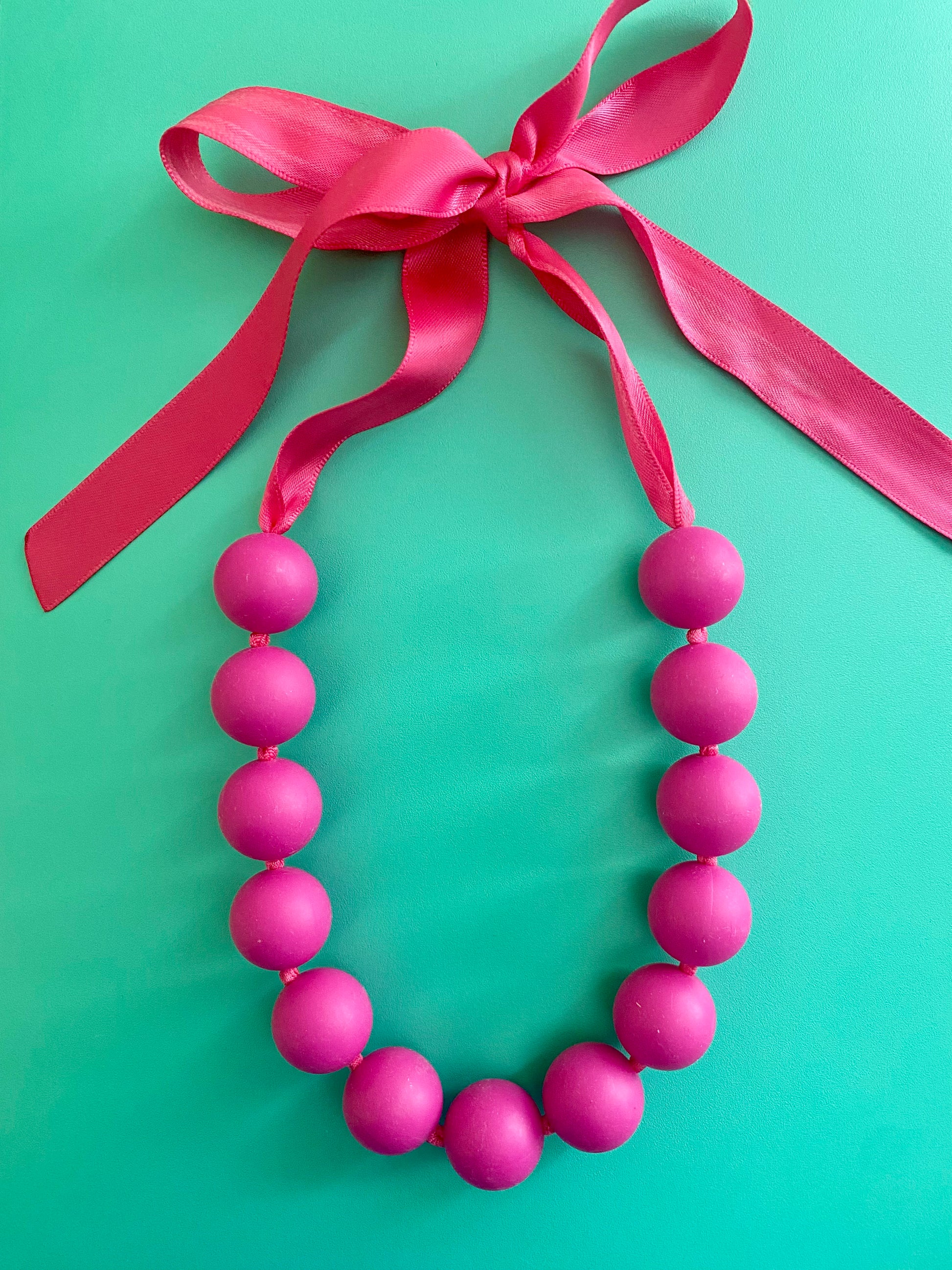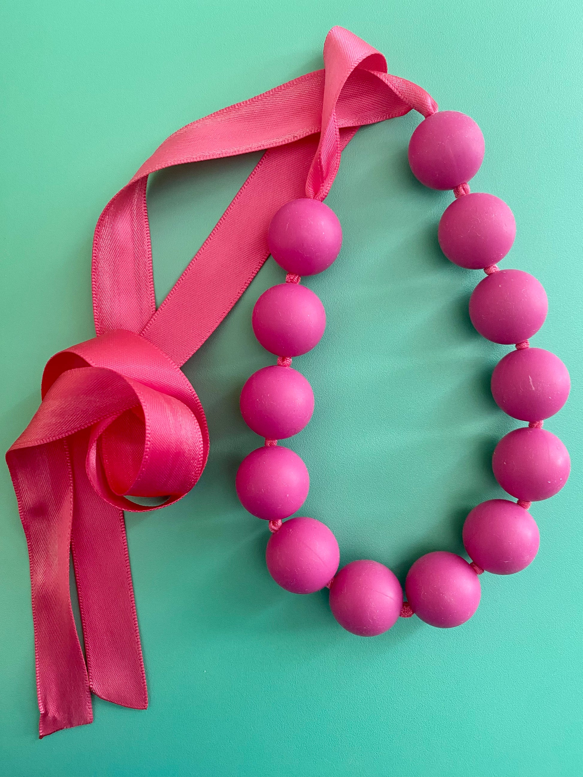 NU ÄNTLIGEN!! De nya läckra halsbanden i MAXI-pärlor är nu här! Ett cerise statement halsband av mjuka stora silikonpärlor som hängs om halsen genom att knyta en rosett av det vackra satinbandet. Ger din stil färg, glädje och personlighet! En läcker accessoar till jobb, vardag eller fest! Finns i många härliga färger! Du kan även köpa halsbanden som ett SET tillsammans med tillhörande armband. Det finns även tillhörande ringar i silver eller guldplätering med den färgglada stora pärlan, se kategori ringar.