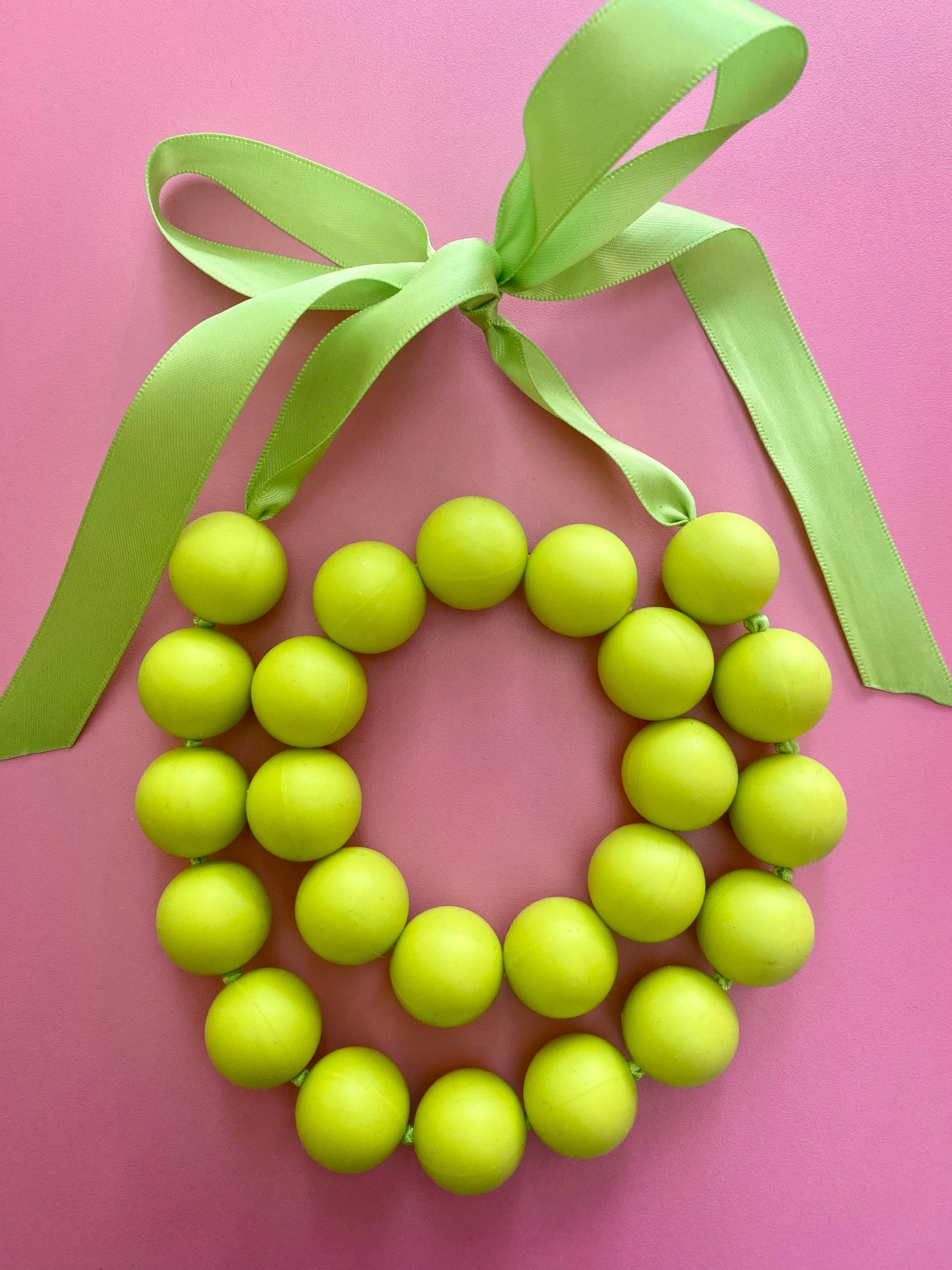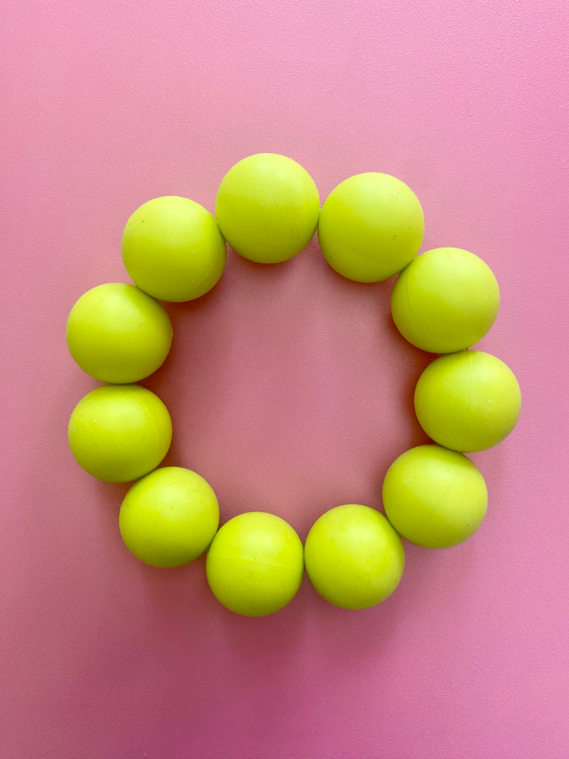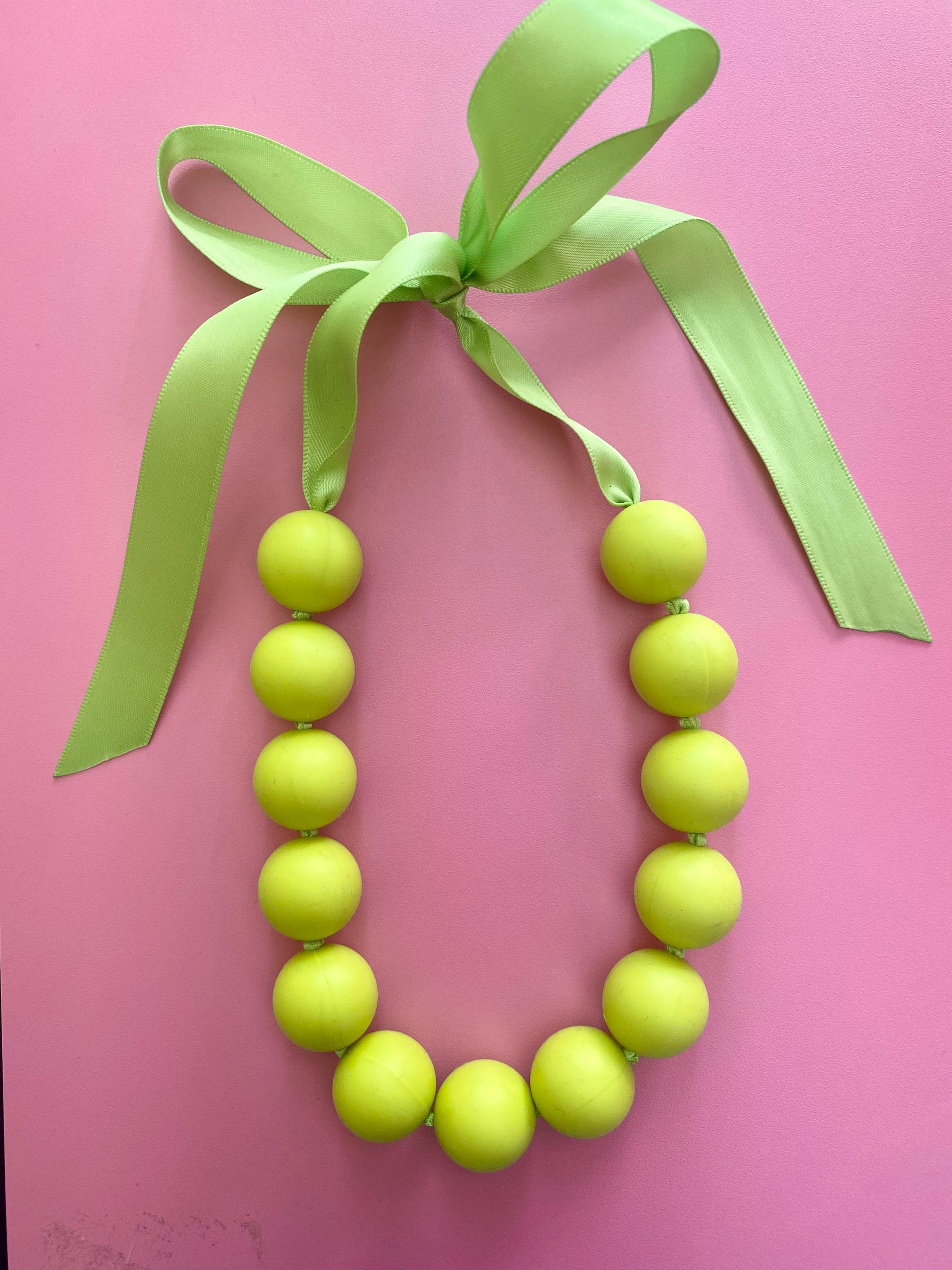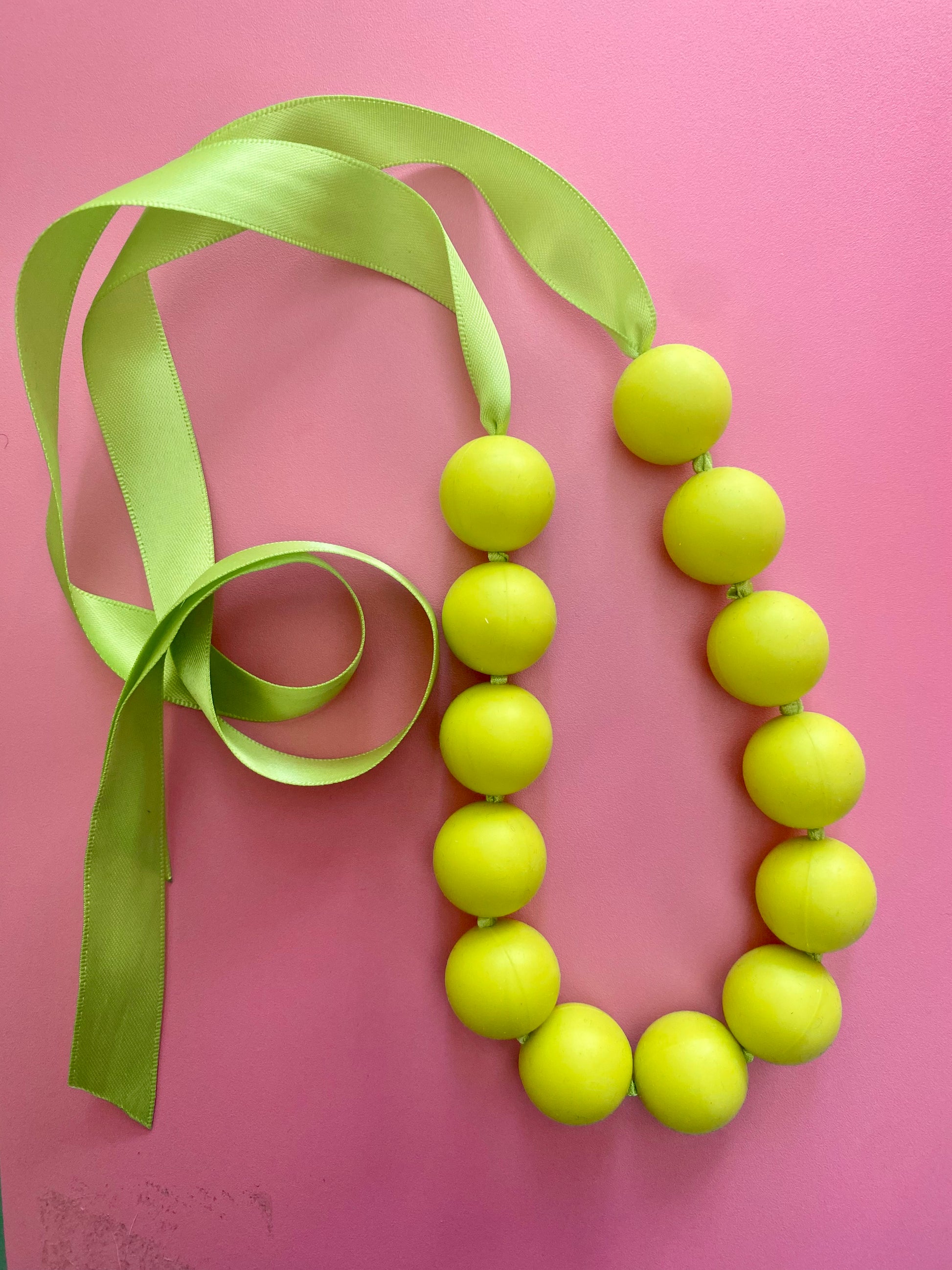 NU ÄNTLIGEN!! De nya läckra halsbanden i MAXI-pärlor är nu här! Ett giftgrönt statement halsband av mjuka stora silikonpärlor som hängs om halsen genom att knyta en rosett av det vackra satinbandet. Ger din stil färg, glädje och personlighet! En läcker accessoar till jobb, vardag eller fest! Finns i många härliga färger! Du kan även köpa halsbanden som ett SET tillsammans med tillhörande armband. Det finns även tillhörande ringar i silver eller guldplätering med den färgglada stora pärlan, se kategori ringar.