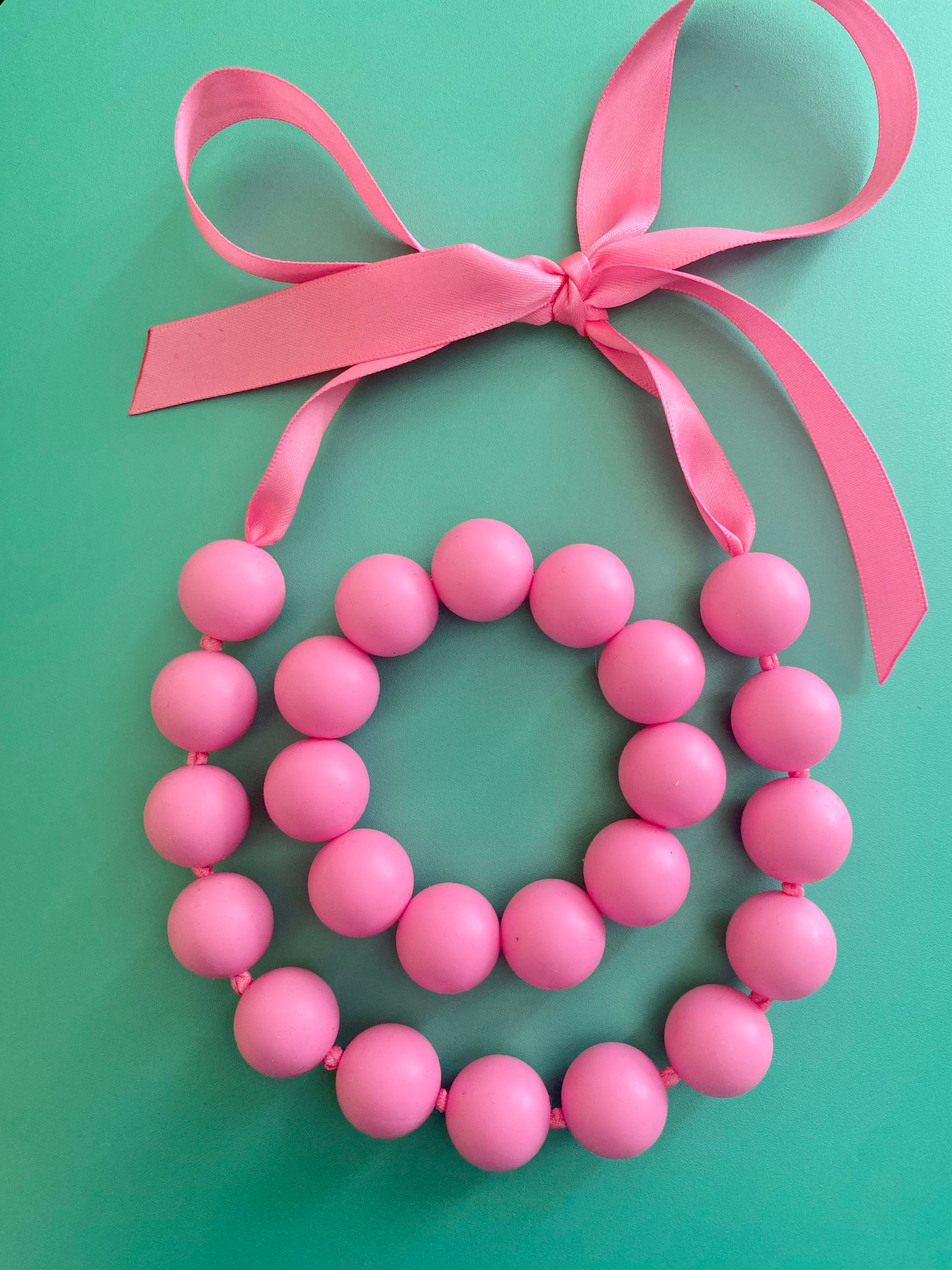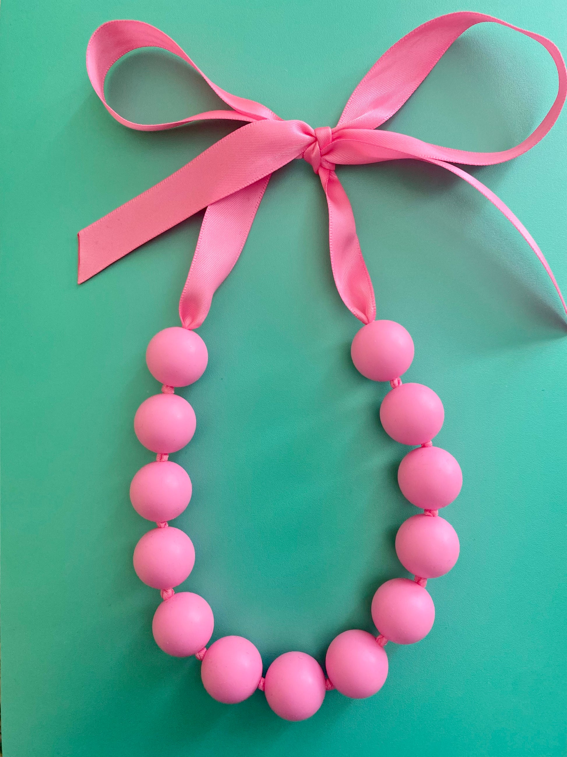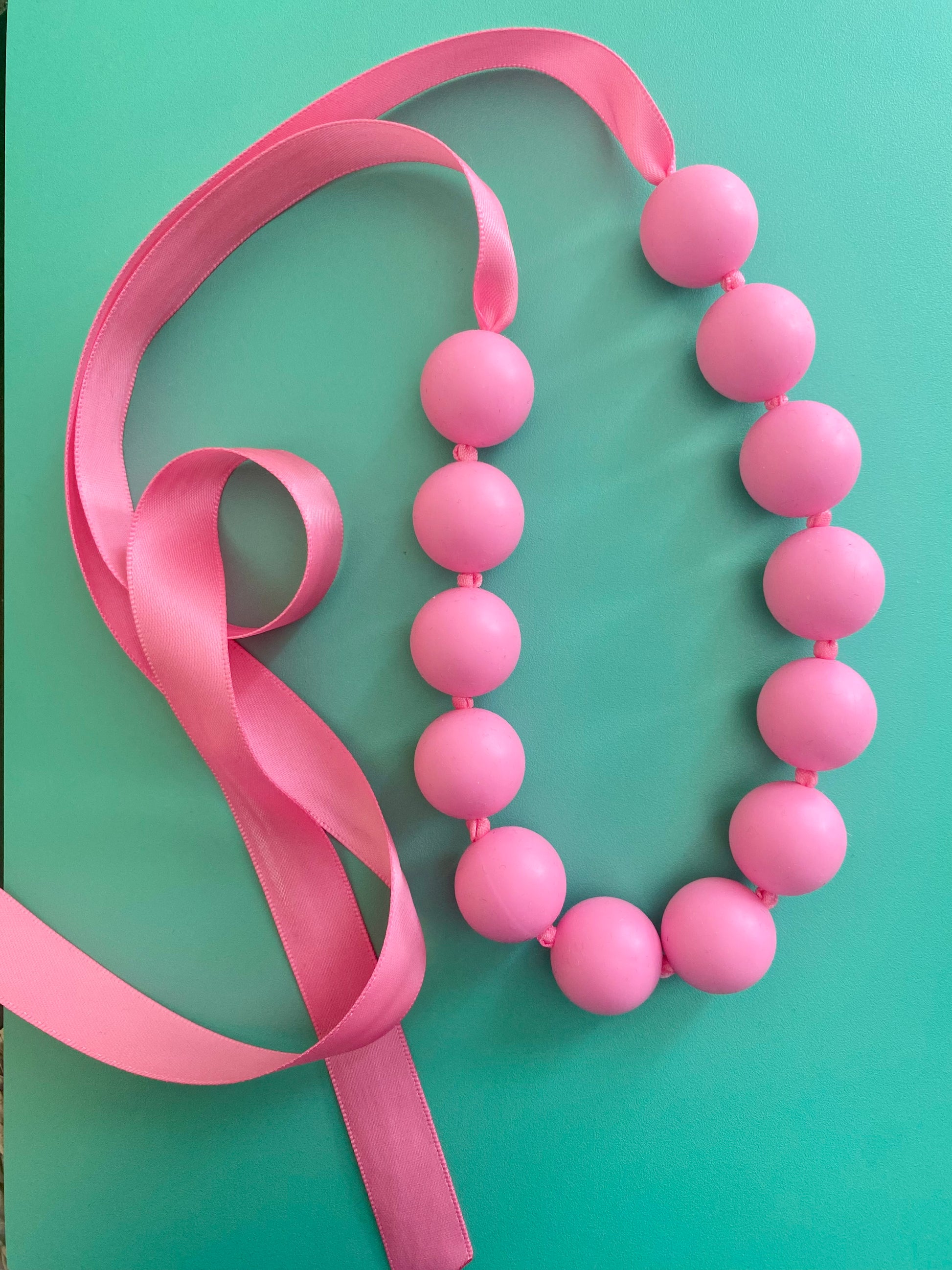 NU ÄNTLIGEN!! De nya läckra halsbanden i MAXI-pärlor är nu här! Ett knallrosa statement halsband av mjuka stora silikonpärlor som hängs om halsen genom att knyta en rosett av det vackra satinbandet. Ger din stil färg, glädje och personlighet! En läcker accessoar till jobb, vardag eller fest! Finns i många härliga färger! Du kan även köpa halsbanden som ett SET tillsammans med tillhörande armband. Det finns även tillhörande ringar i silver eller guldplätering med den färgglada stora pärlan, se kategori ringar.