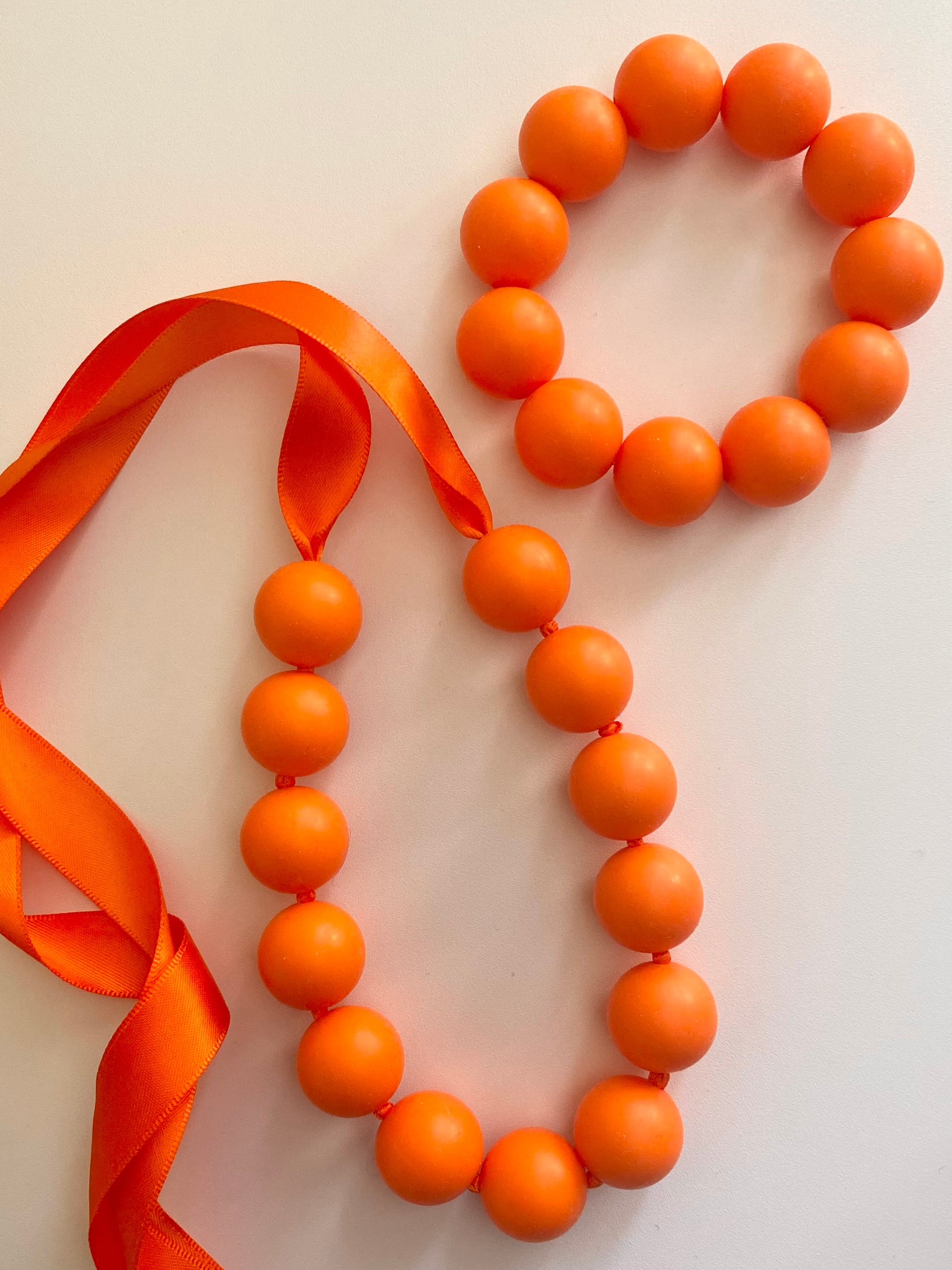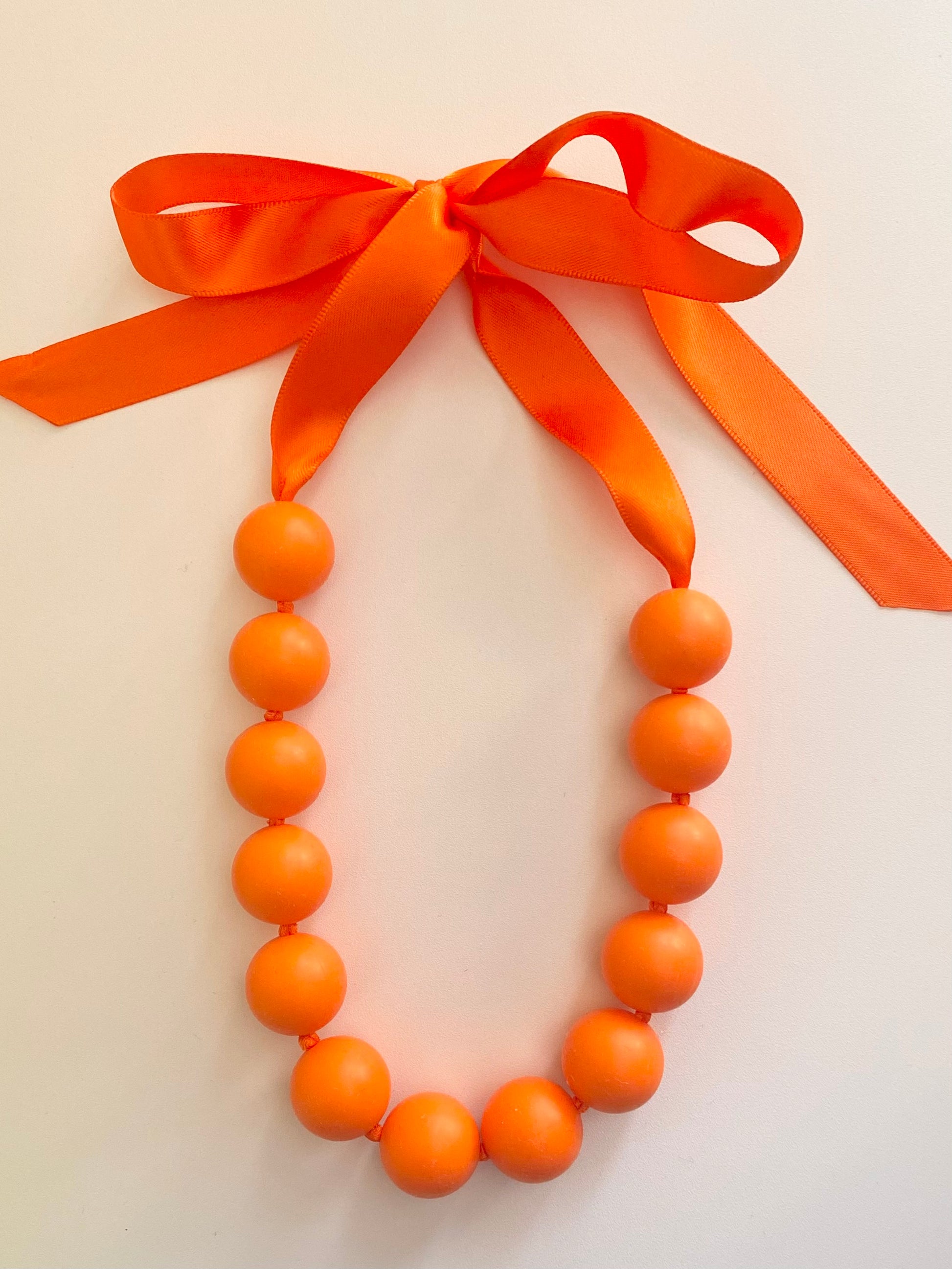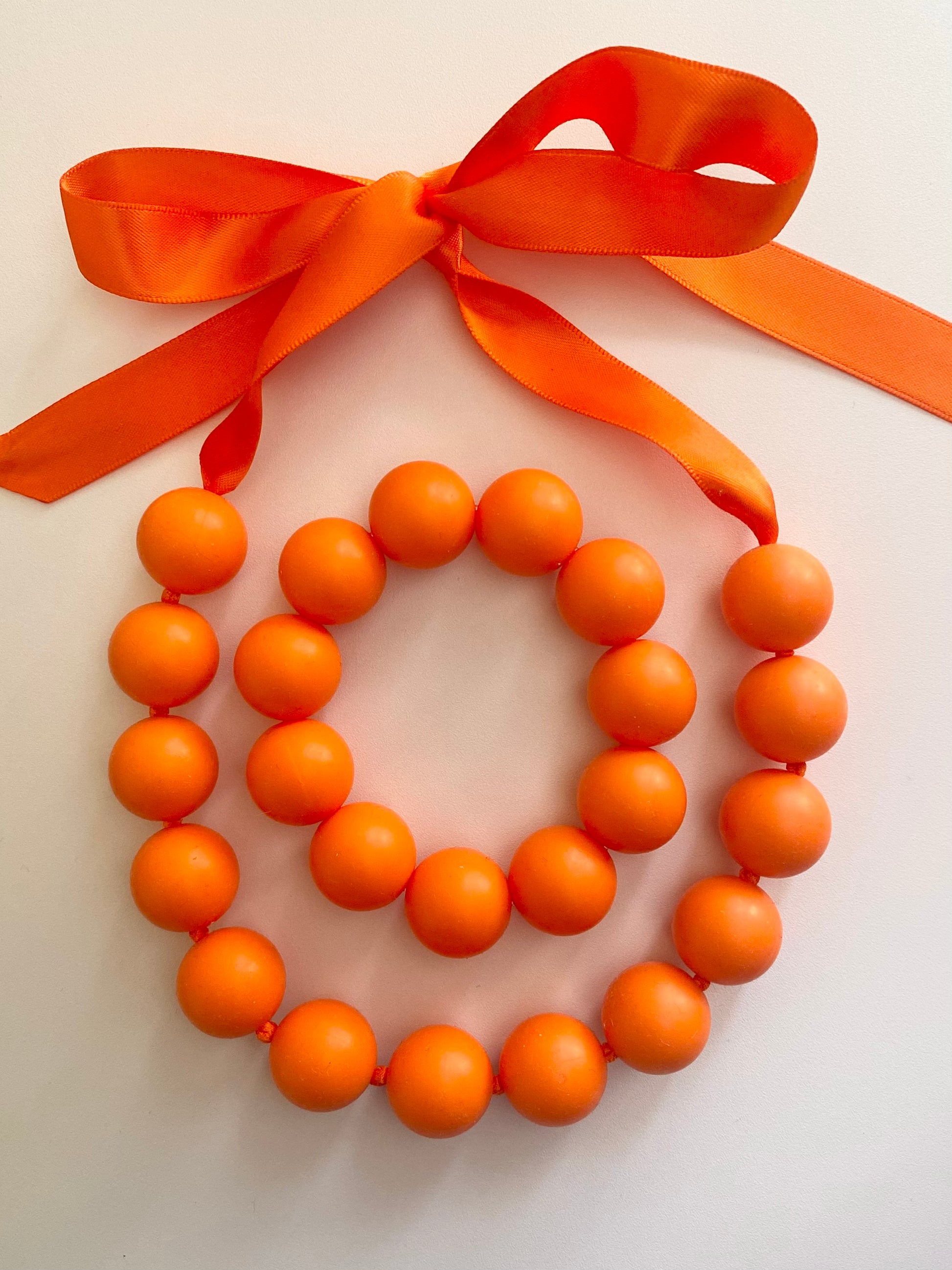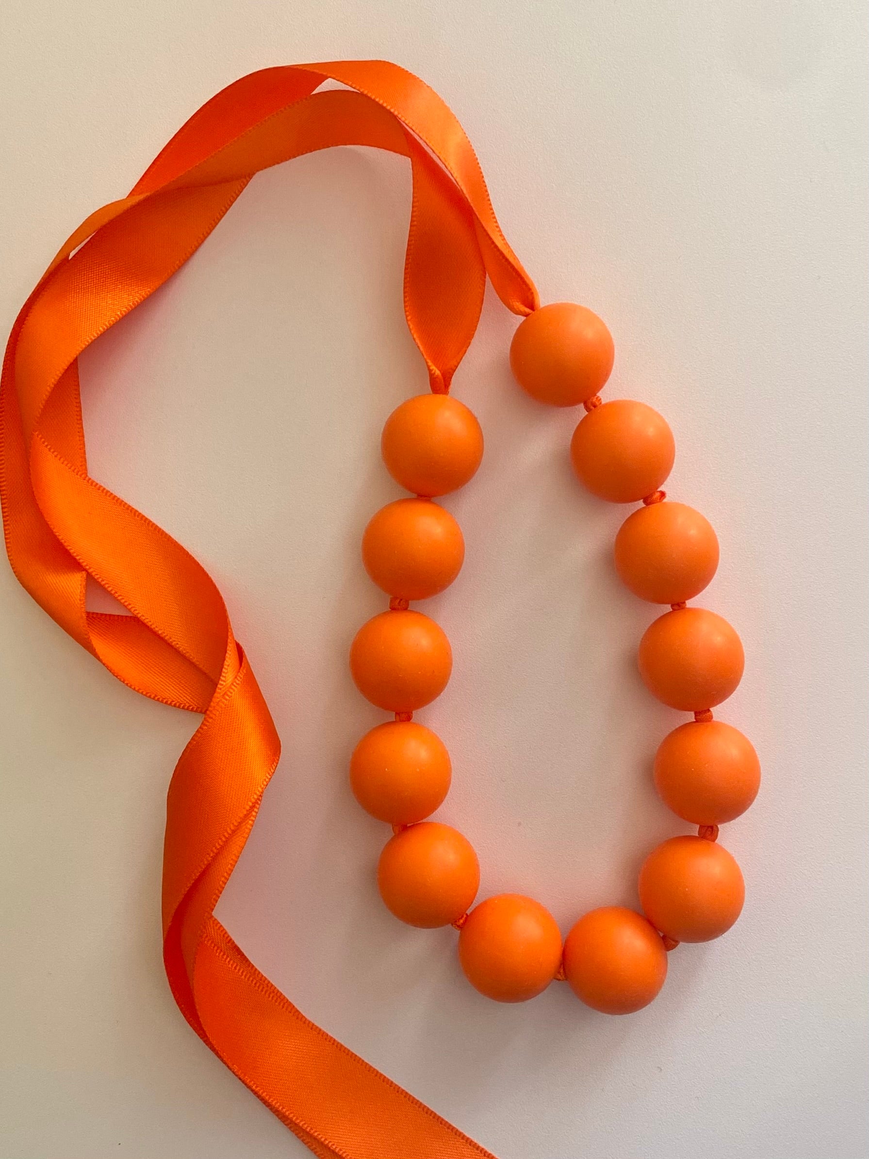 NU ÄNTLIGEN!! De nya läckra halsbanden i MAXI-pärlor är nu här! Ett orange statement halsband av mjuka stora silikonpärlor som hängs om halsen genom att knyta en rosett av det vackra satinbandet. Ger din stil färg, glädje och personlighet! En läcker accessoar till jobb, vardag eller fest! Finns i många härliga färger! Du kan även köpa halsbanden som ett SET tillsammans med tillhörande armband. Det finns även tillhörande ringar i silver eller guldplätering med den färgglada stora pärlan, se kategori ringar.