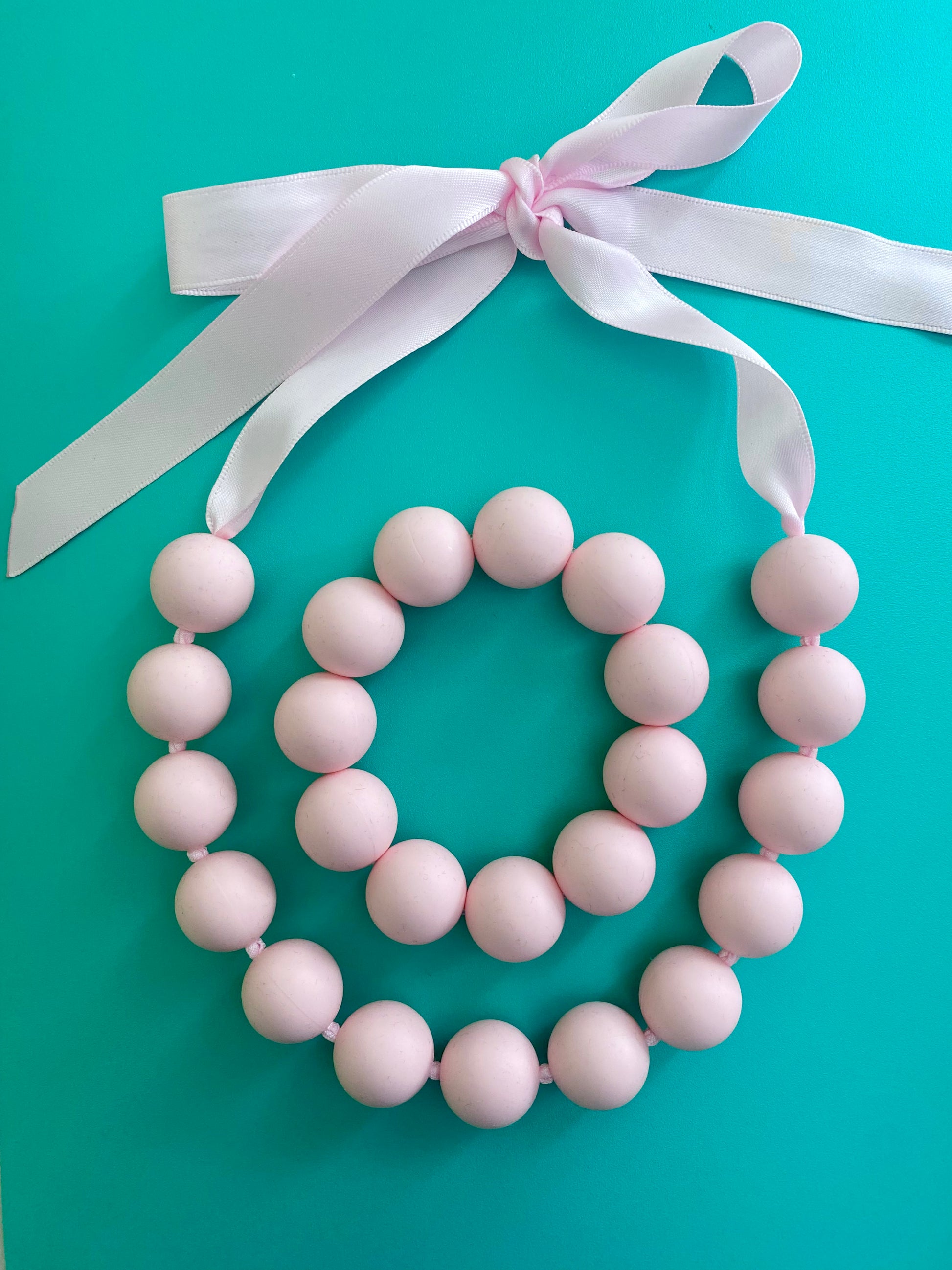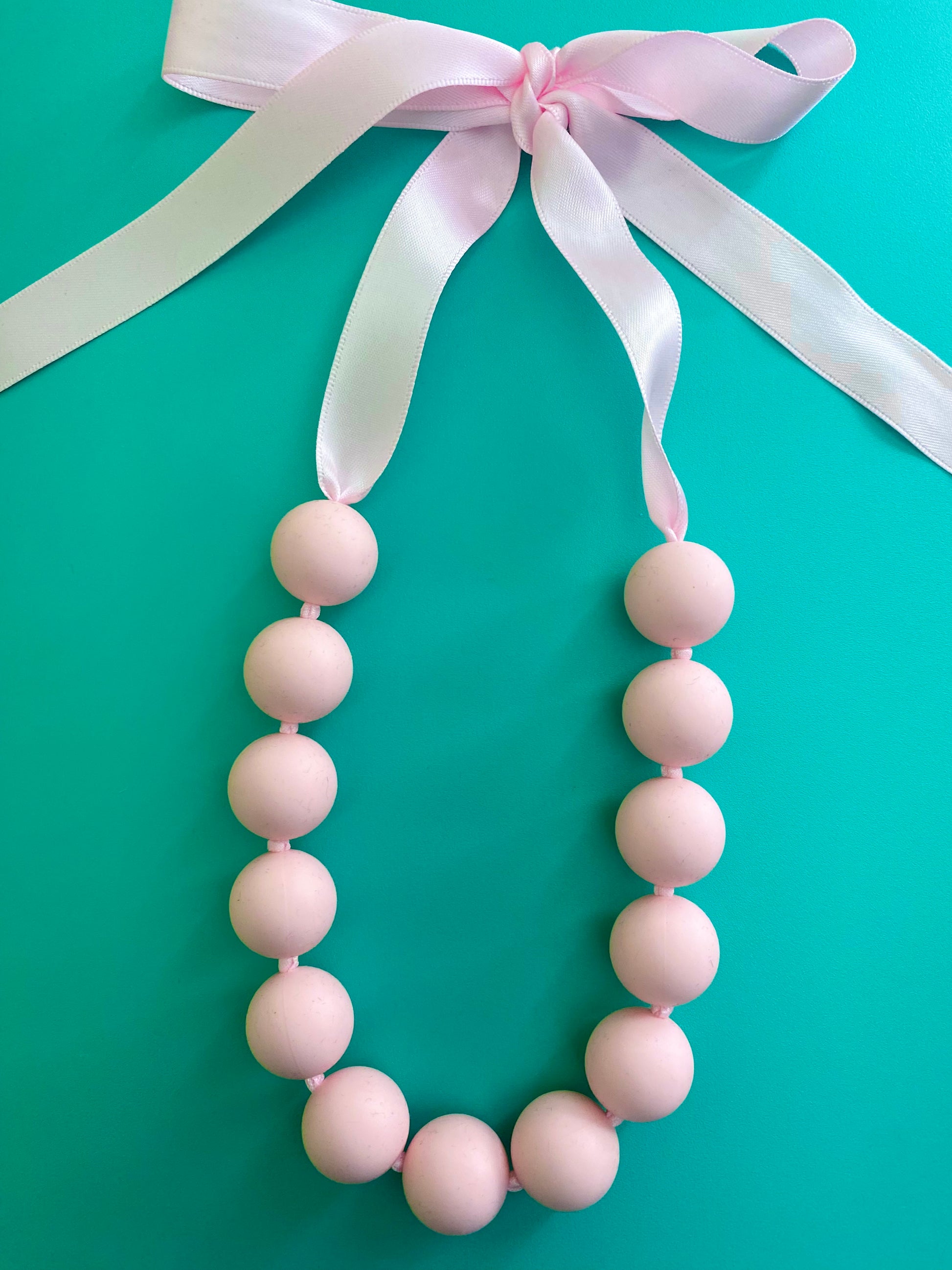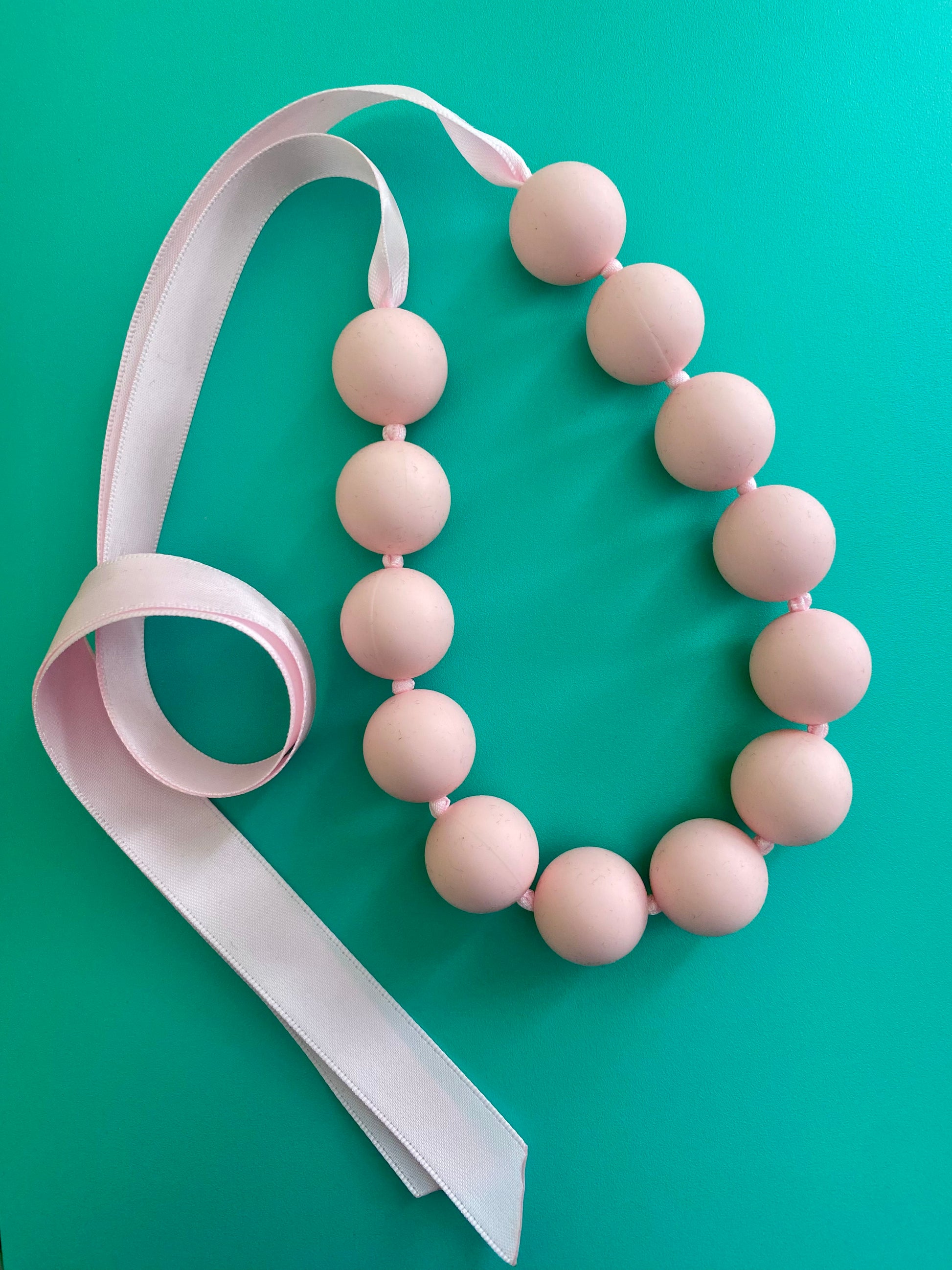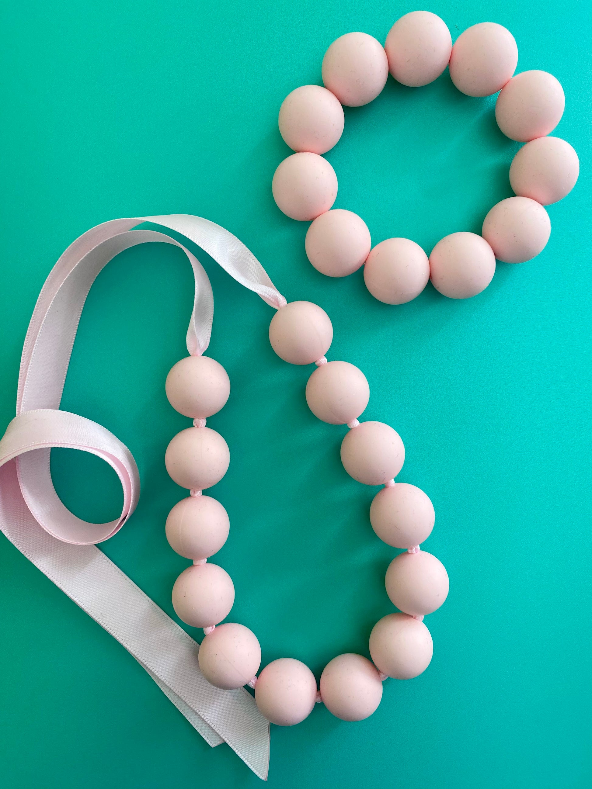 NU ÄNTLIGEN!! De nya läckra halsbanden i MAXI-pärlor är nu här! Ett ljusrosa statement halsband av mjuka stora silikonpärlor som hängs om halsen genom att knyta en rosett av det vackra satinbandet. Ger din stil färg, glädje och personlighet! En läcker accessoar till jobb, vardag eller fest! Finns i många härliga färger! Du kan även köpa halsbanden som ett SET tillsammans med tillhörande armband. Det finns även tillhörande ringar i silver eller guldplätering med den färgglada stora pärlan, se kategori ringar.