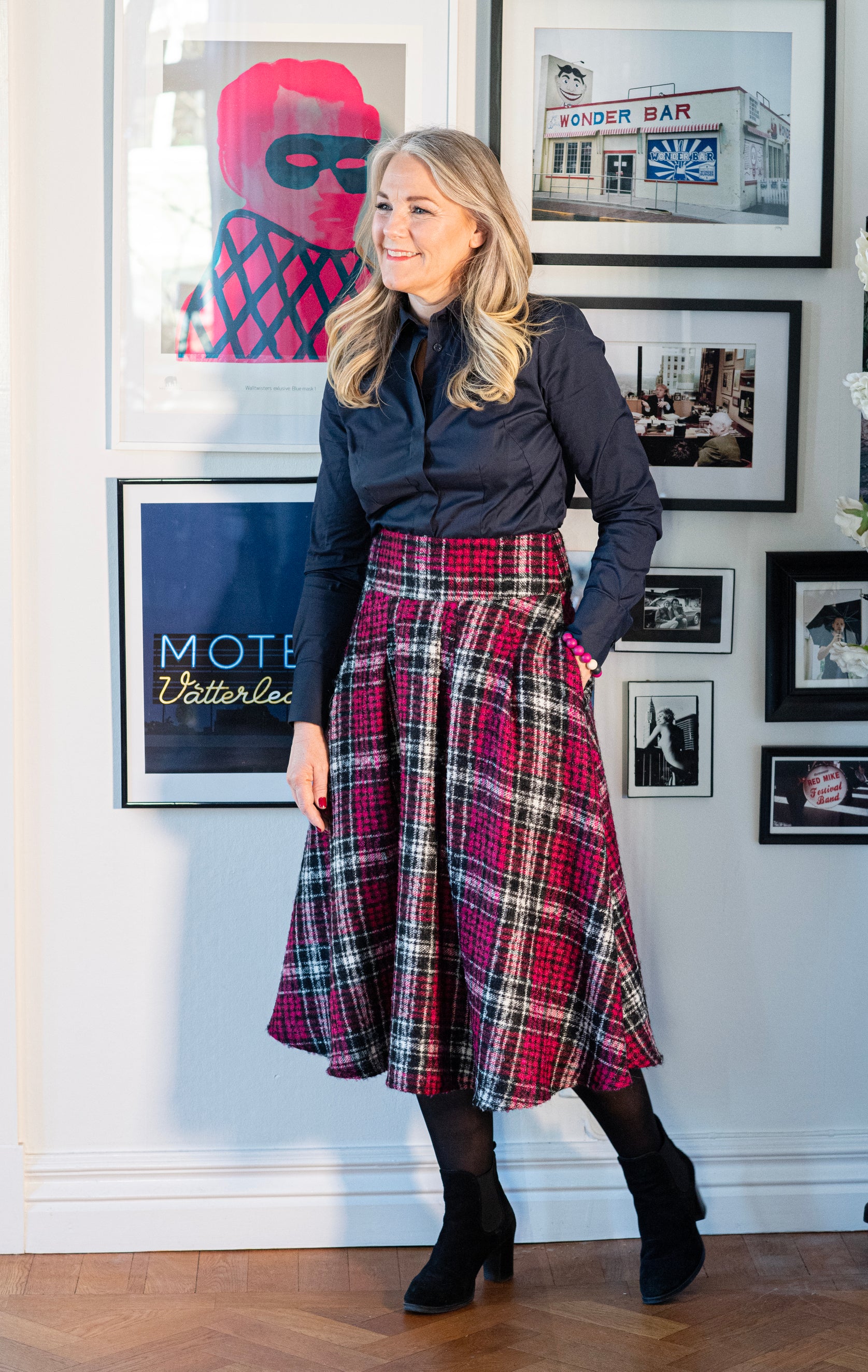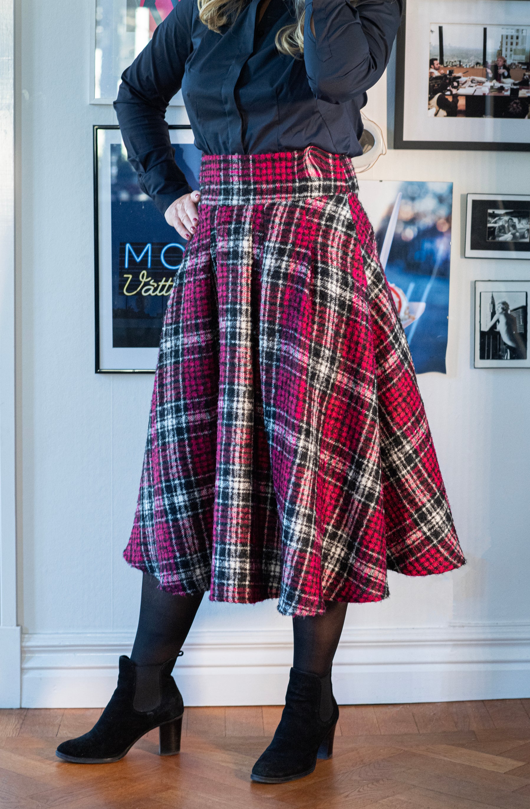 The Power Skirt är en A-linje formad kjol med en bred linning, mycket vidd och fickor. Den har lagda nersydda veck fram och dragkedja bak. Detta tyg (Rutig Röd/Violett) är ett mycket följsamt, mjukt men ändå kraftigt ulltyg i en klassisk ruta. Väljer du mellan två storlekar - välj då den mindre.
