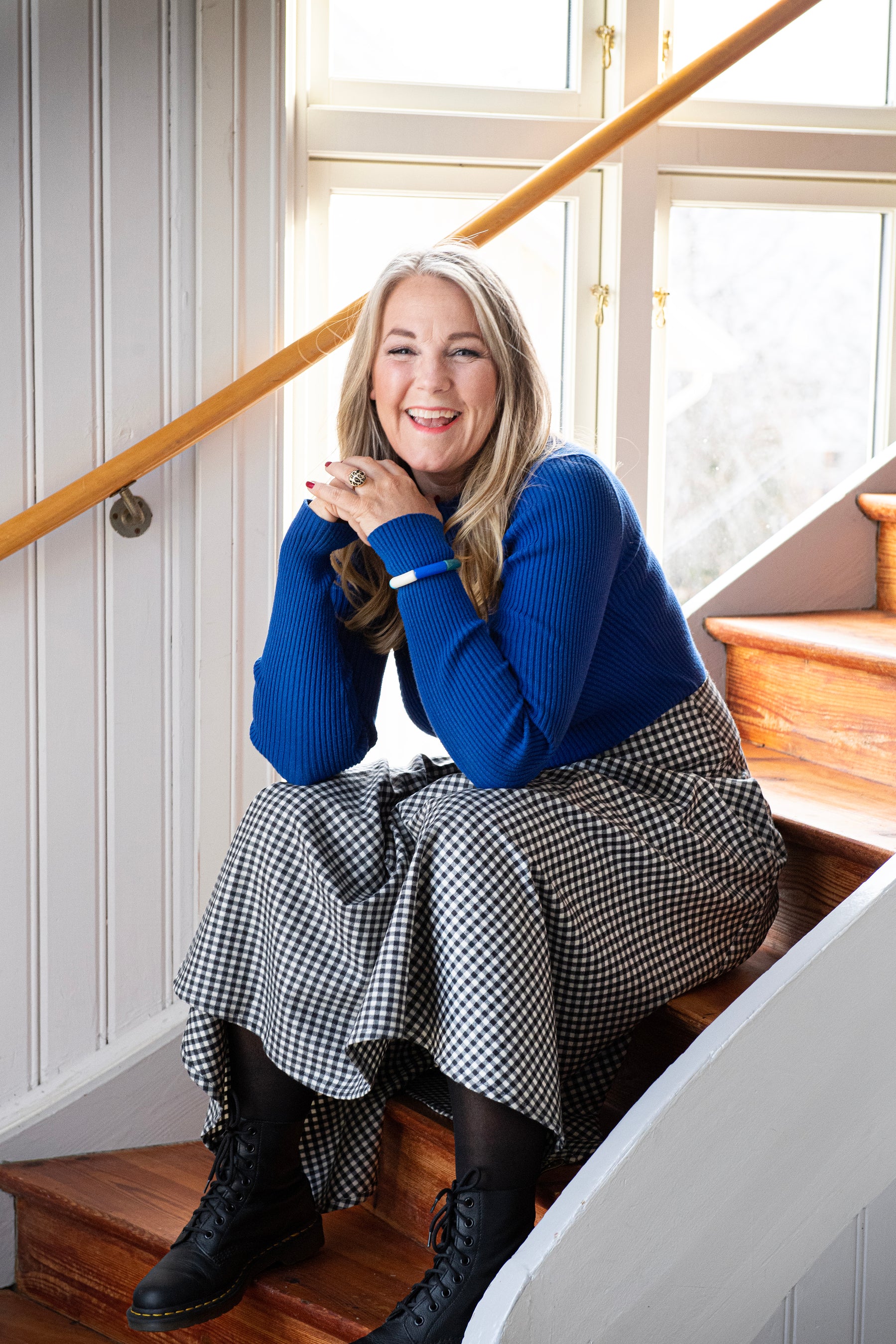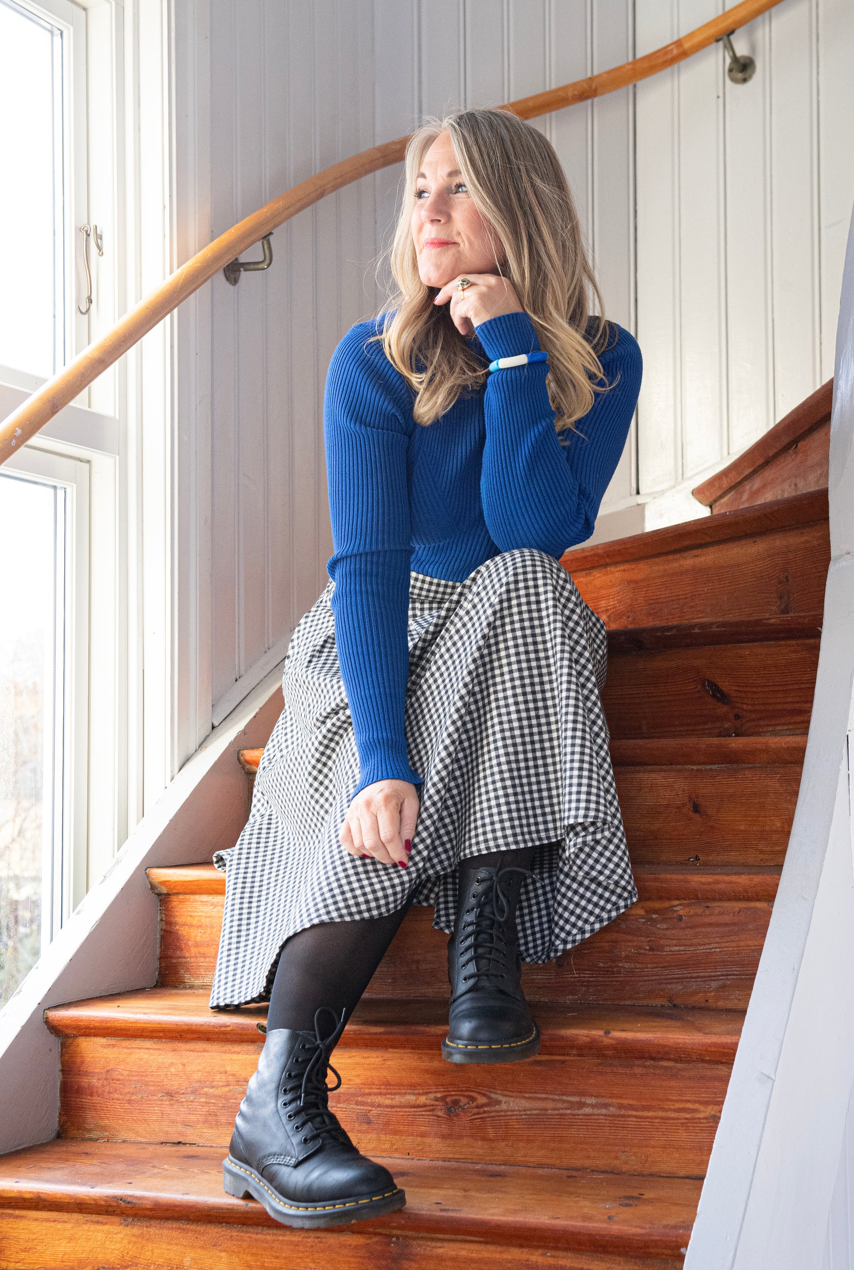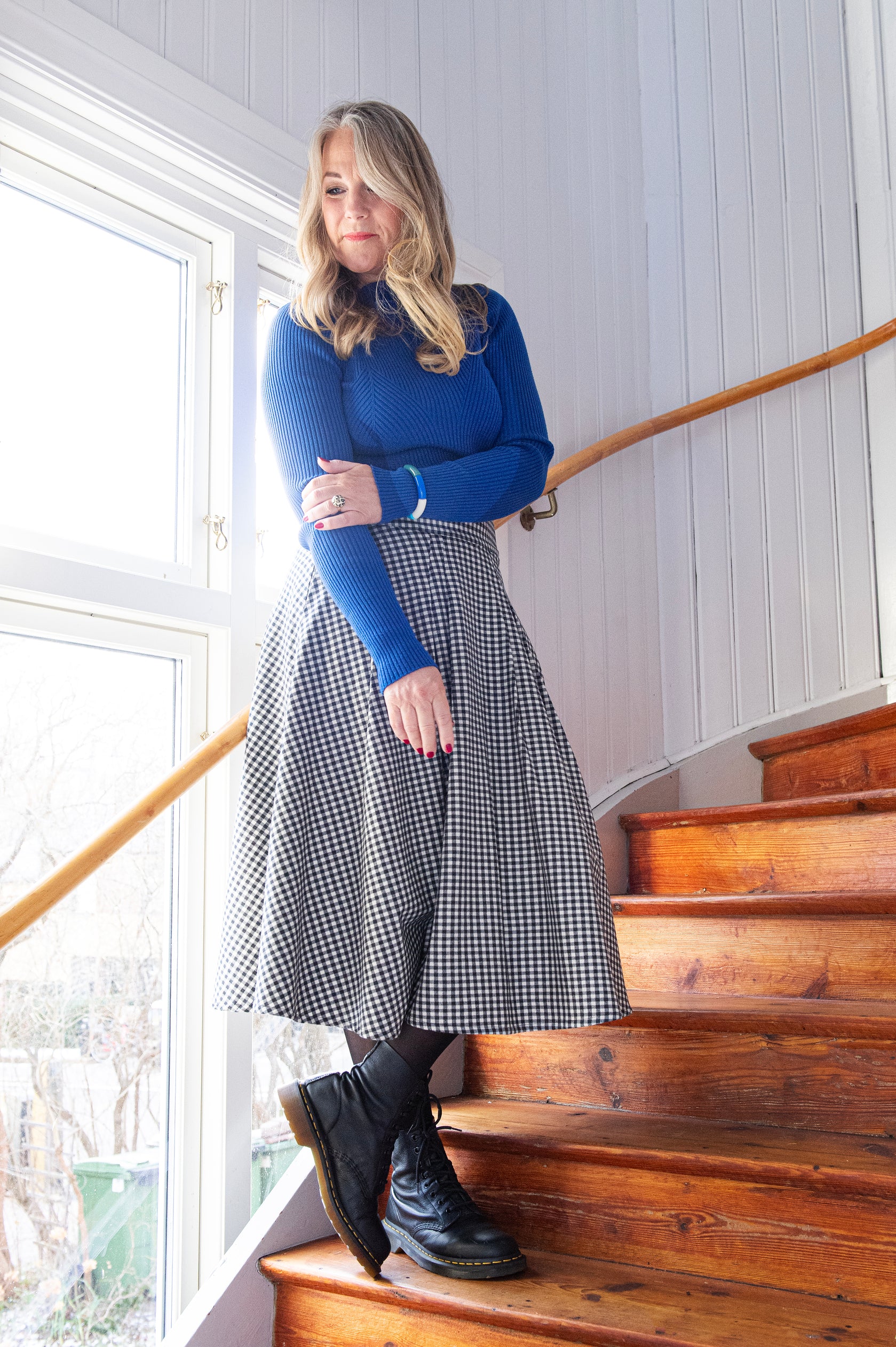 The Power Skirt är en A-linje formad kjol med en bred linning, mycket vidd och fickor. Den har lagda nersydda veck fram och dragkedja bak. Detta tyg (Rutig Svart/Vit) är ett mycket följsamt, mjukt men ändå kraftigt elastiskt tyg i en klassisk ruta. Väljer du mellan två storlekar - välj då den mindre.