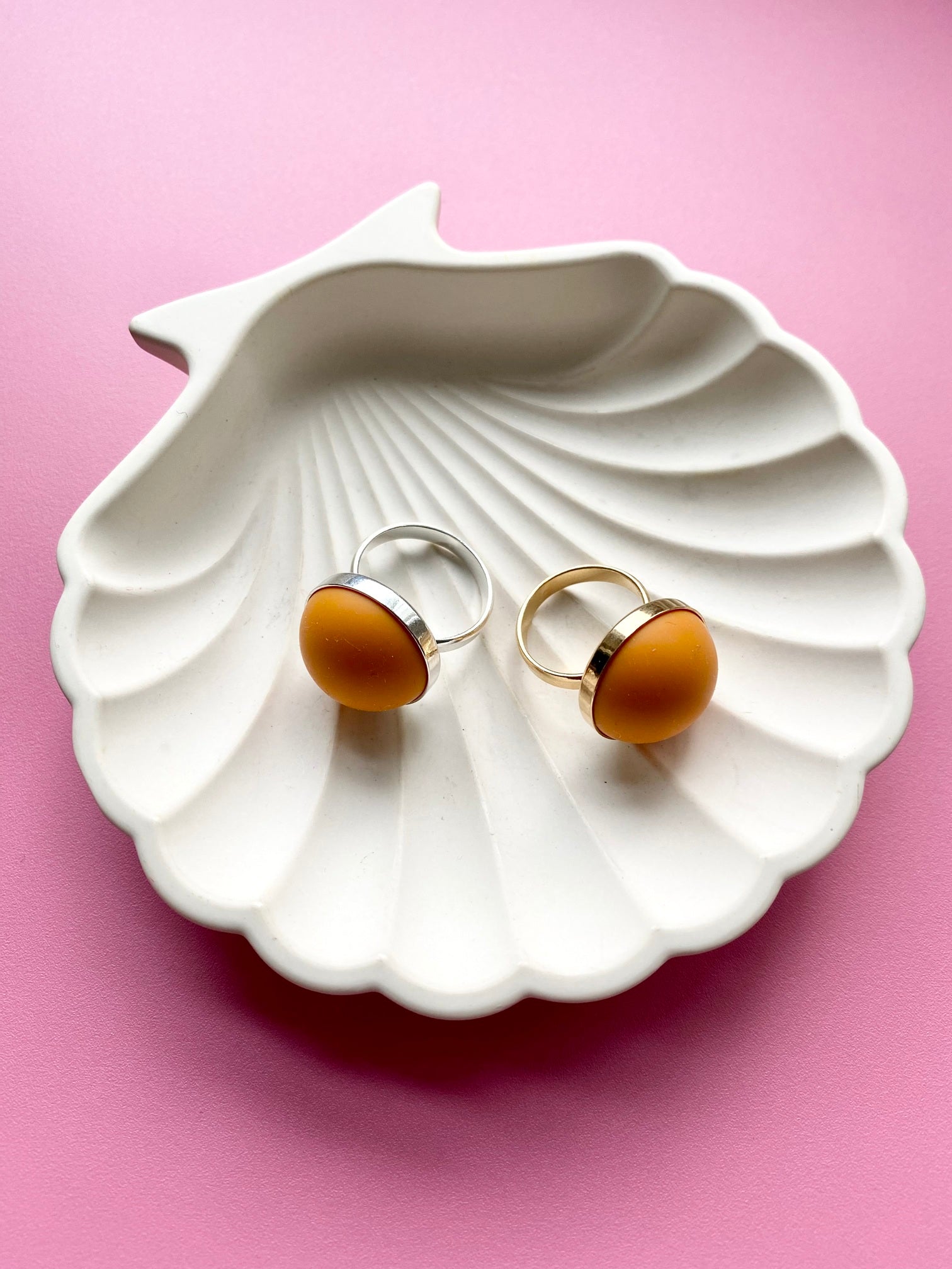 Cool och vacker ring med en mild orange pärla (19 mm) i giftfri mjuk silikon. 100% silver eller 18 karats guldplätering., En lekfull cool accessoar som blir en kul färgklick till din outfit!