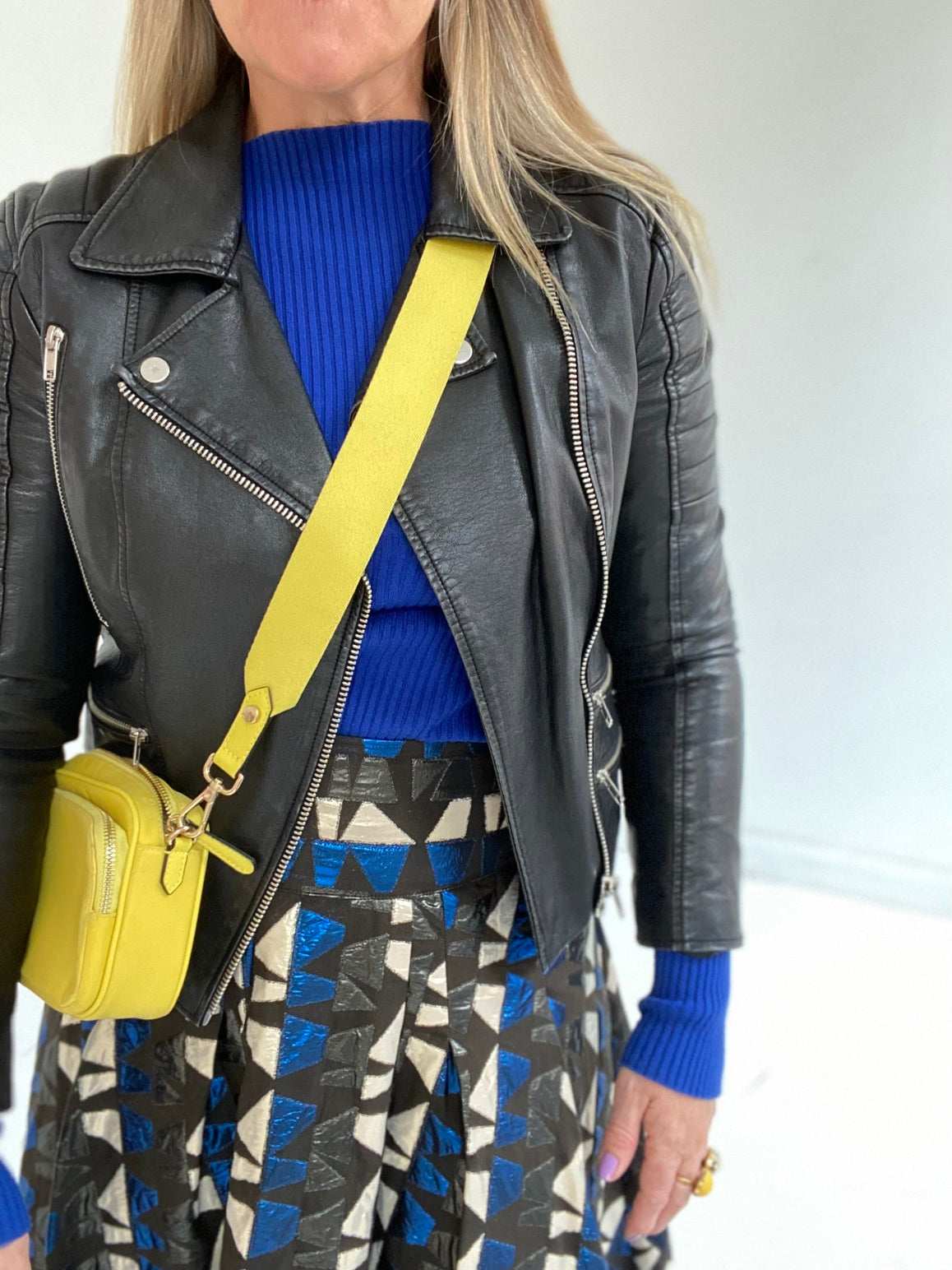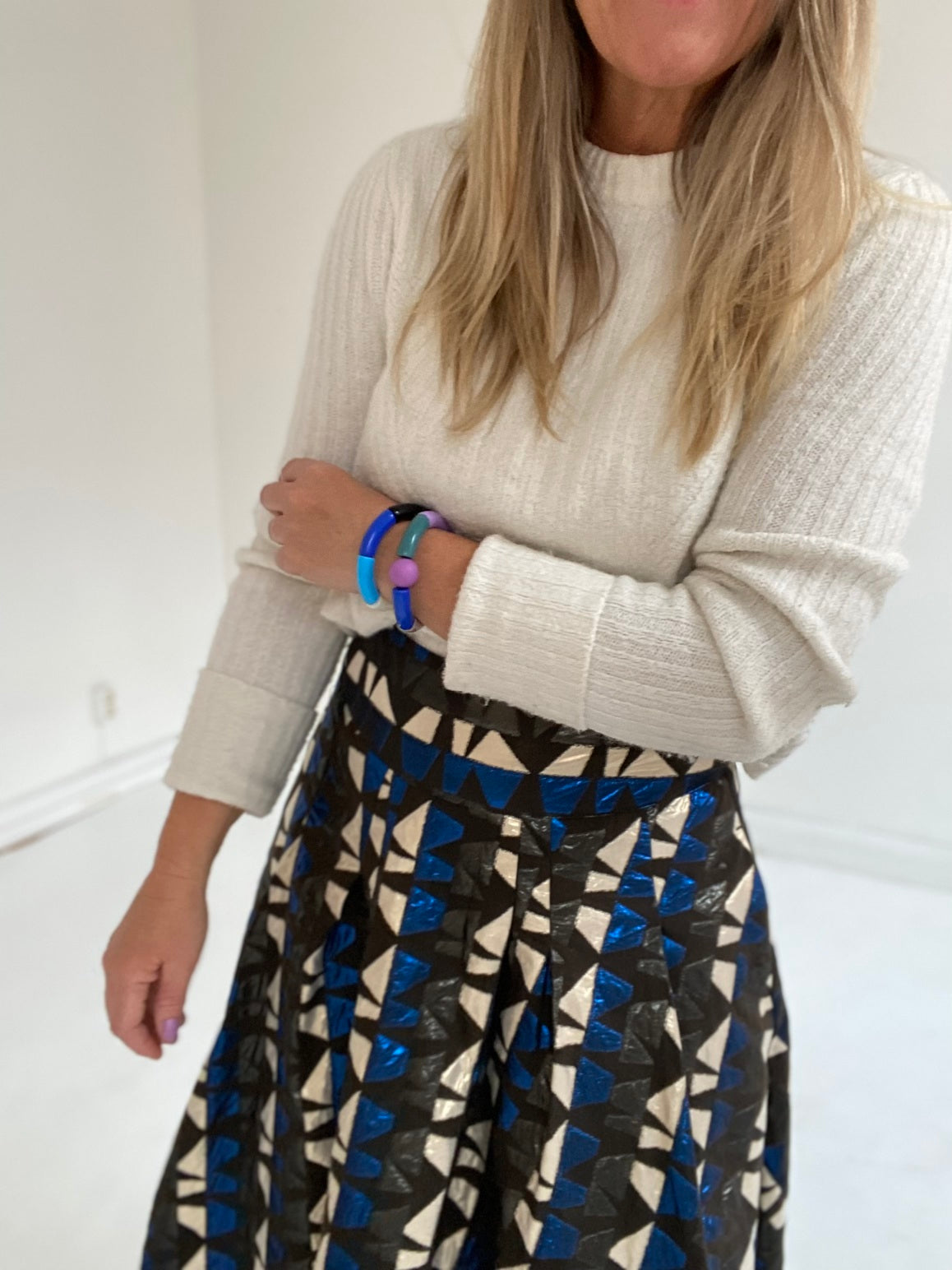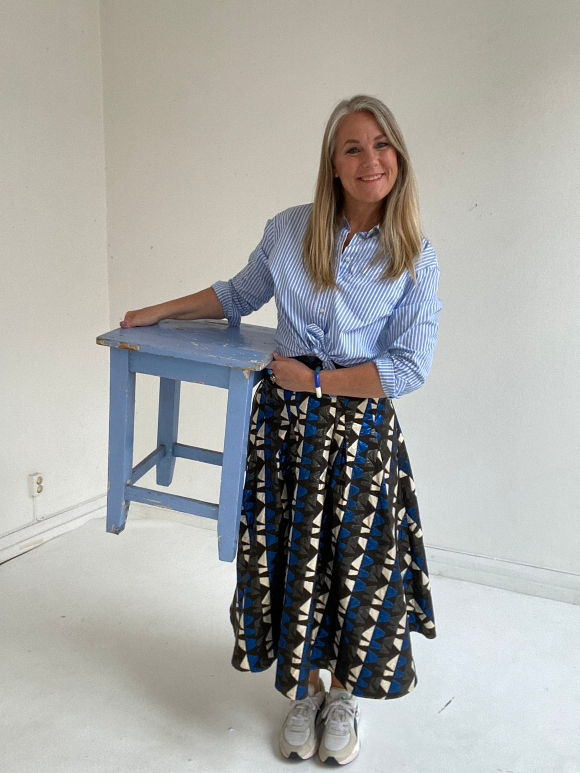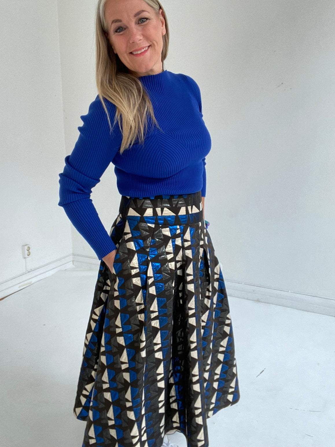 The Power Skirt är en A-linje formad kjol med en bred linning, mycket vidd och fickor. Den har lagda nedsydda veck fram och dragkedja bak. Detta tyg (Blå Grafisk Triangel) är ett exklusivt tyg som är mycket följsamt och skrynklar inte alls. Väger nästan ingenting men har ändå härlig volym, en magisk kjol helt enkelt.