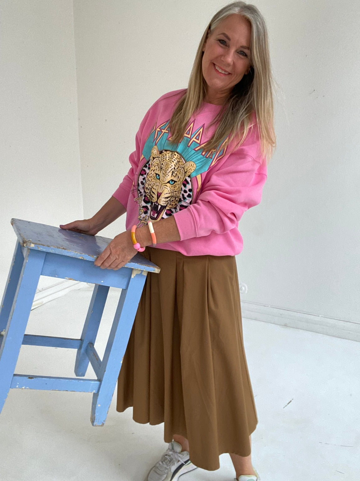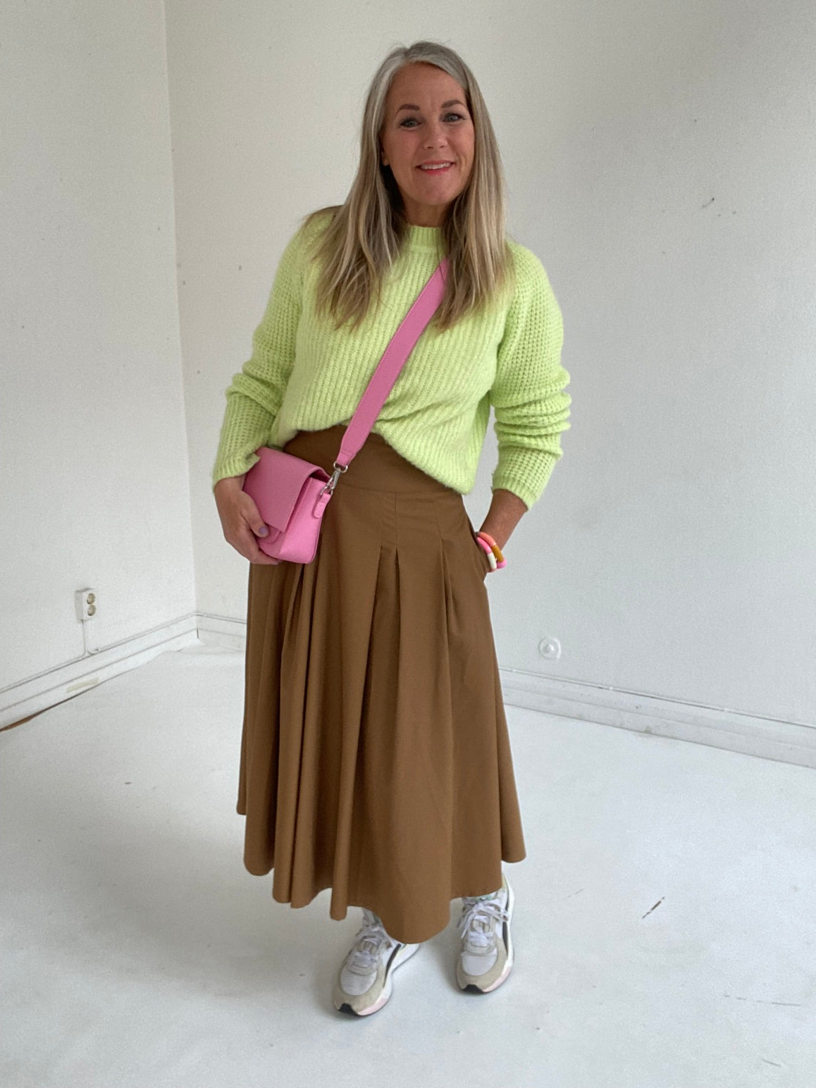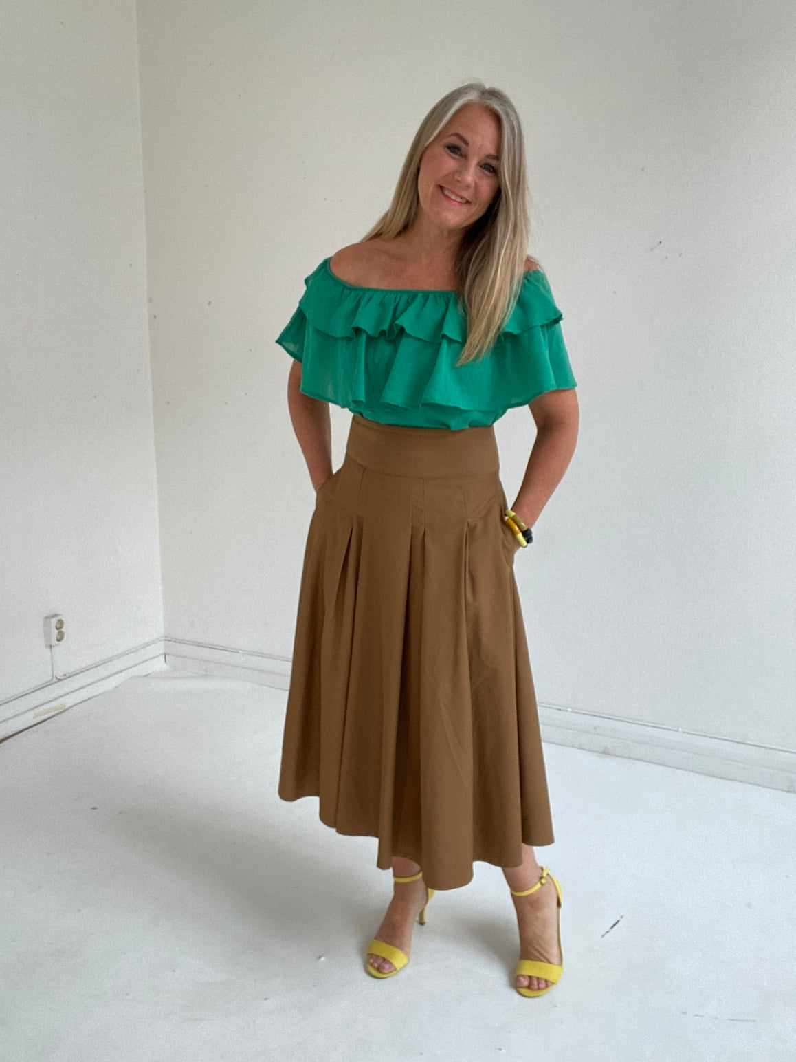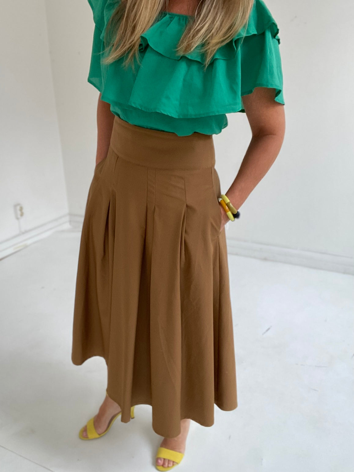 The Power Skirt är en A-linje formad kjol med en bred linning, mycket vidd och fickor. Den har lagda nedsydda veck fram och dragkedja bak. Detta tyg (Mild Brun) är ett exklusivt kraftigt och krispigt tyg som är mycket följsamt.