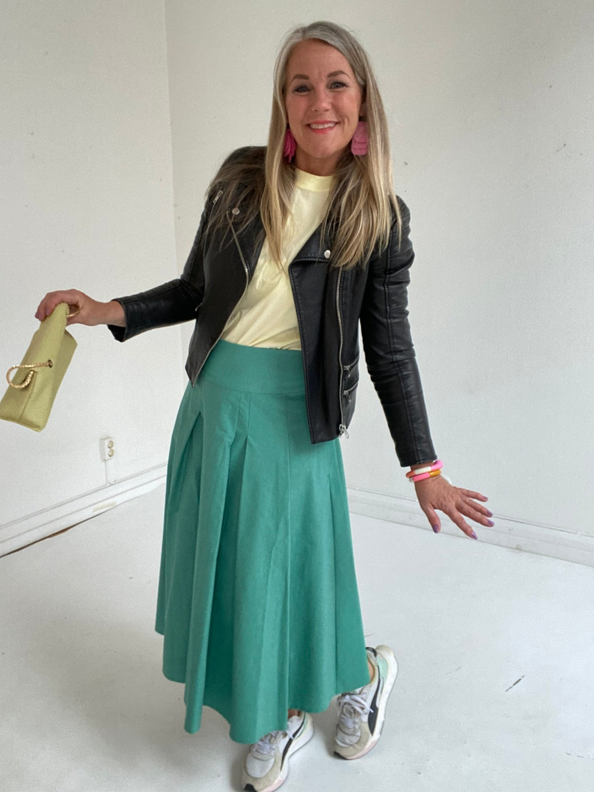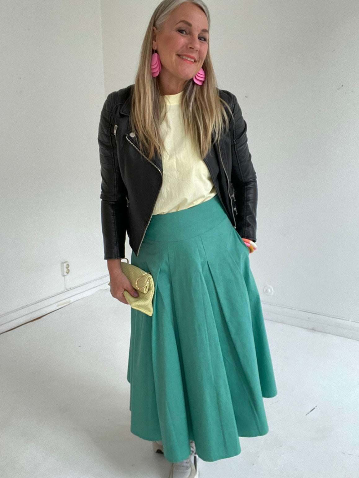 The Power Skirt är en A-linje formad kjol med en bred linning, mycket vidd och fickor. Den har lagda nedsydda veck fram och dragkedja bak. Detta tyg (Mild Grön) är ett exklusivt kraftigt tyg som är mycket följsamt.